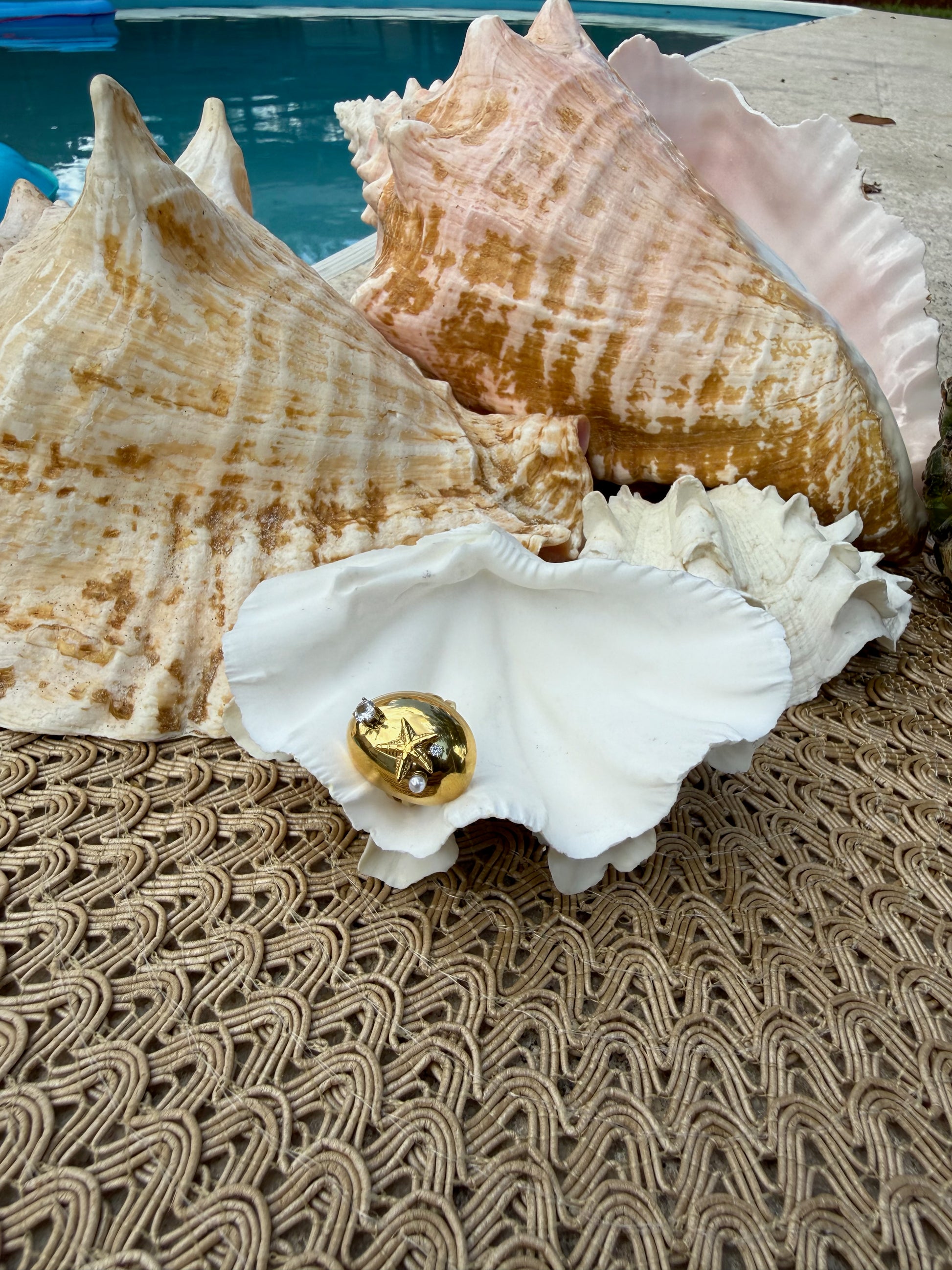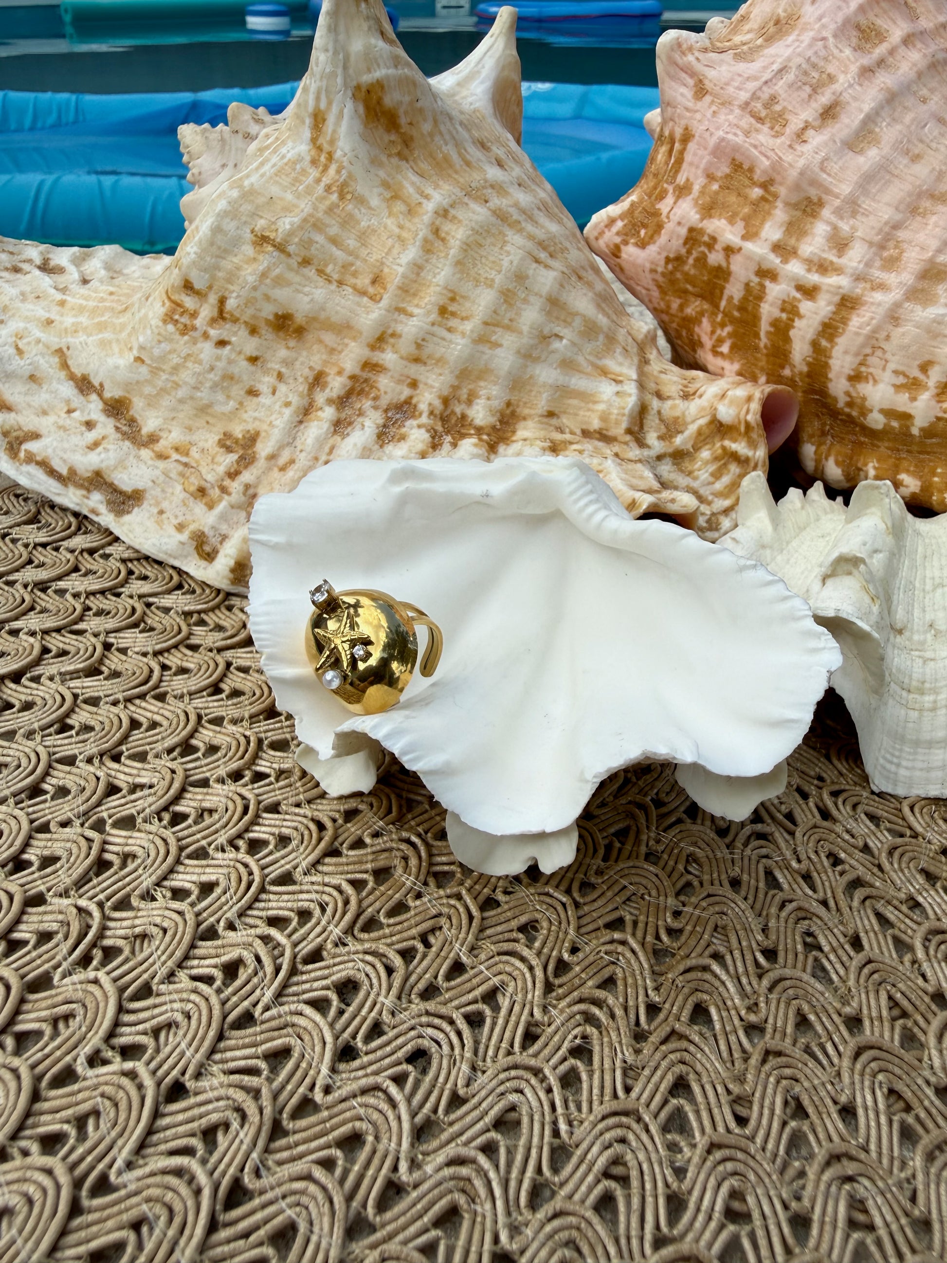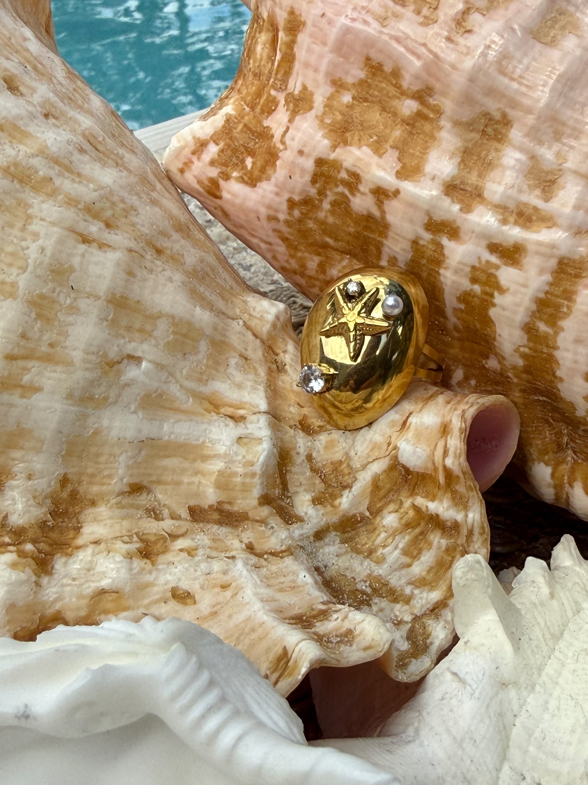 A tiny star whispered into gold — like a seaside wish kept close to your heart. This sculpted gold ring features a raised starfish kissed with little pearl and crystal droplets, echoing tidepool shimmer and sunlit shores.