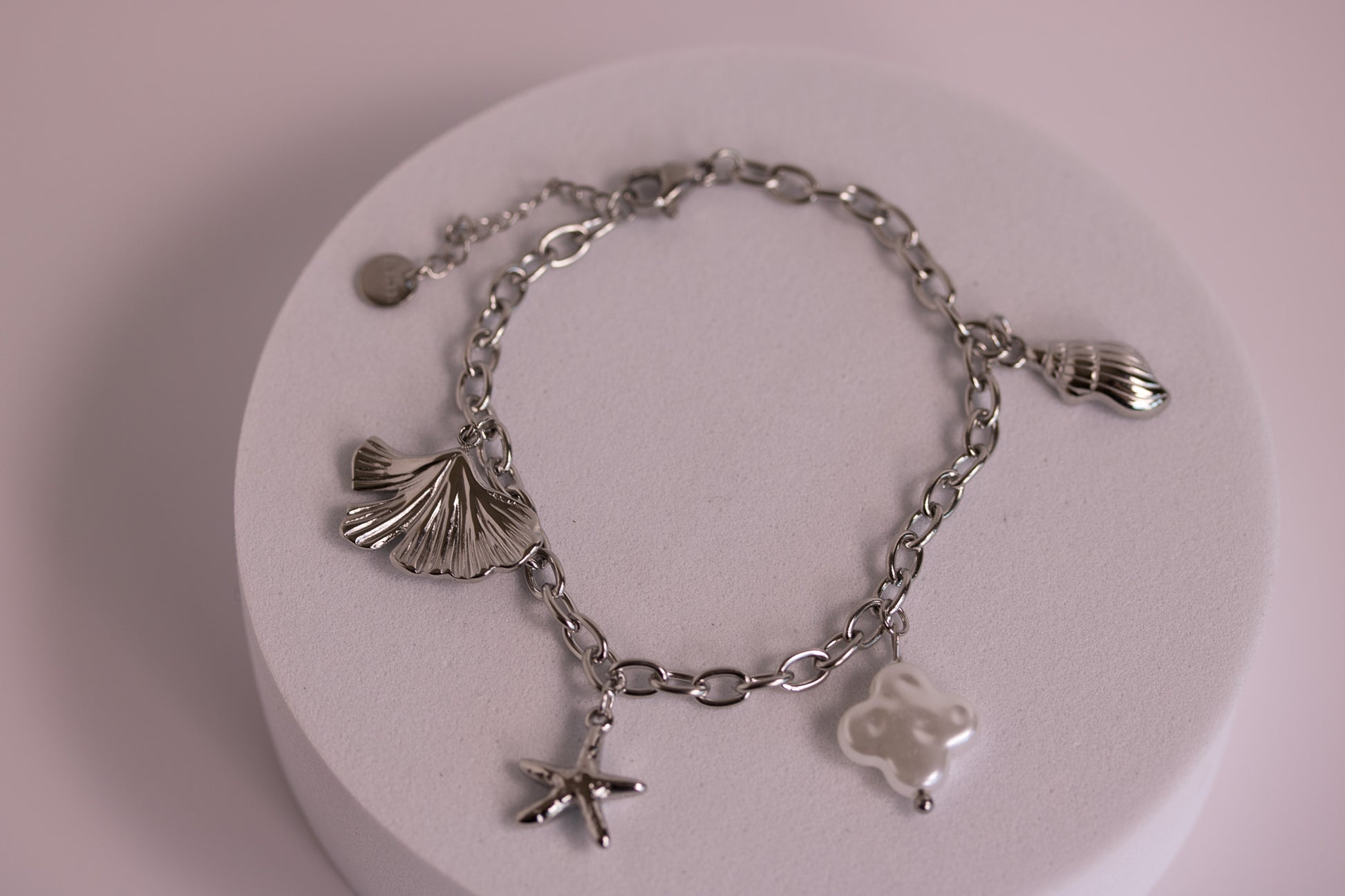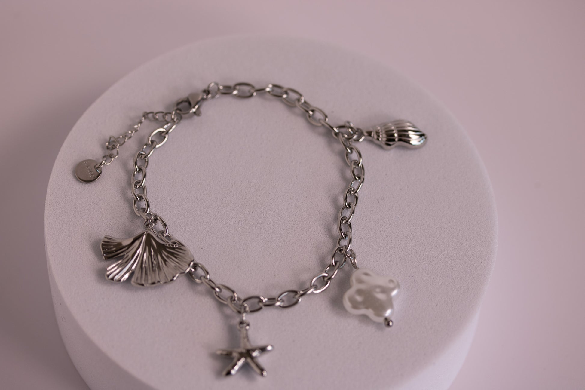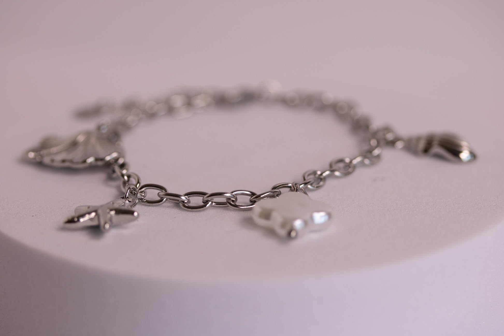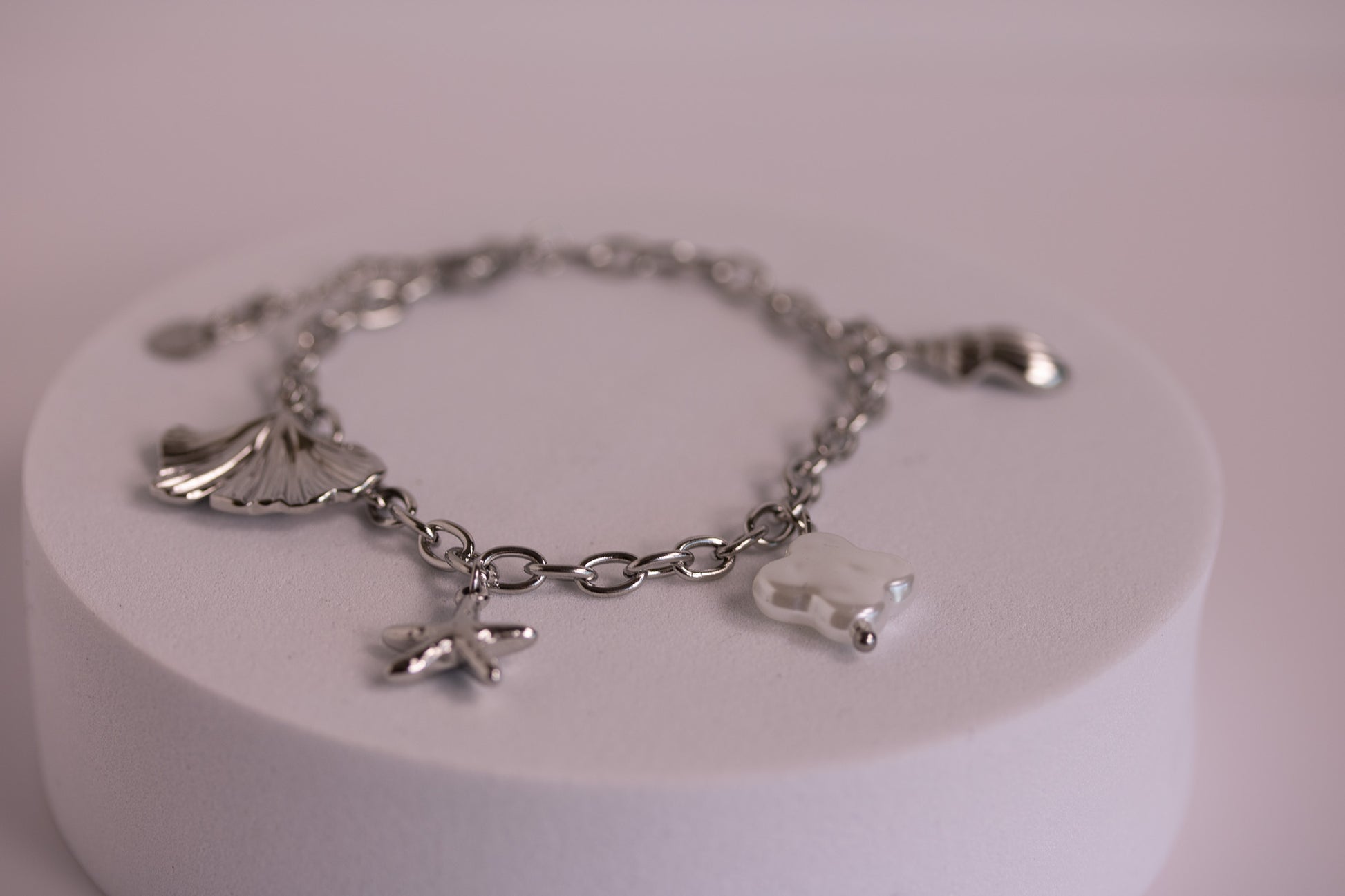A little shimmer, a little shoreline magic. The Seabreeze Charm Bracelet features a polished silver chain adorned with coastal treasures — a scallop shell, starfish, flowing tail fin, and a pearly accent charm that catches the light like seafoam. Each charm adds its own whisper of the ocean, creating a piece that feels playful, breezy, and beautifully wearable.