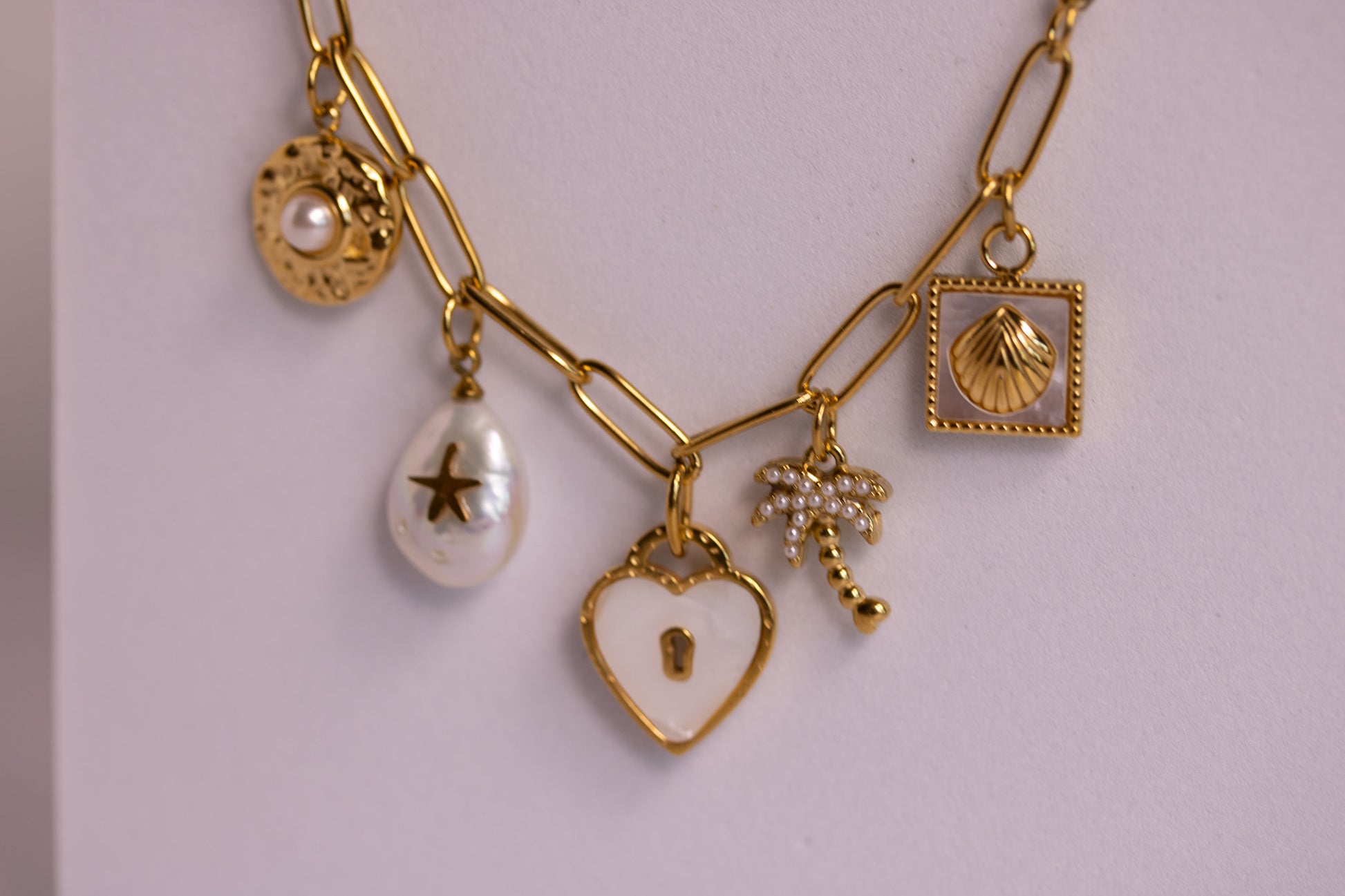 Features pearl coin, starry teardrop pearl, heart lock, palm tree, and shell charms