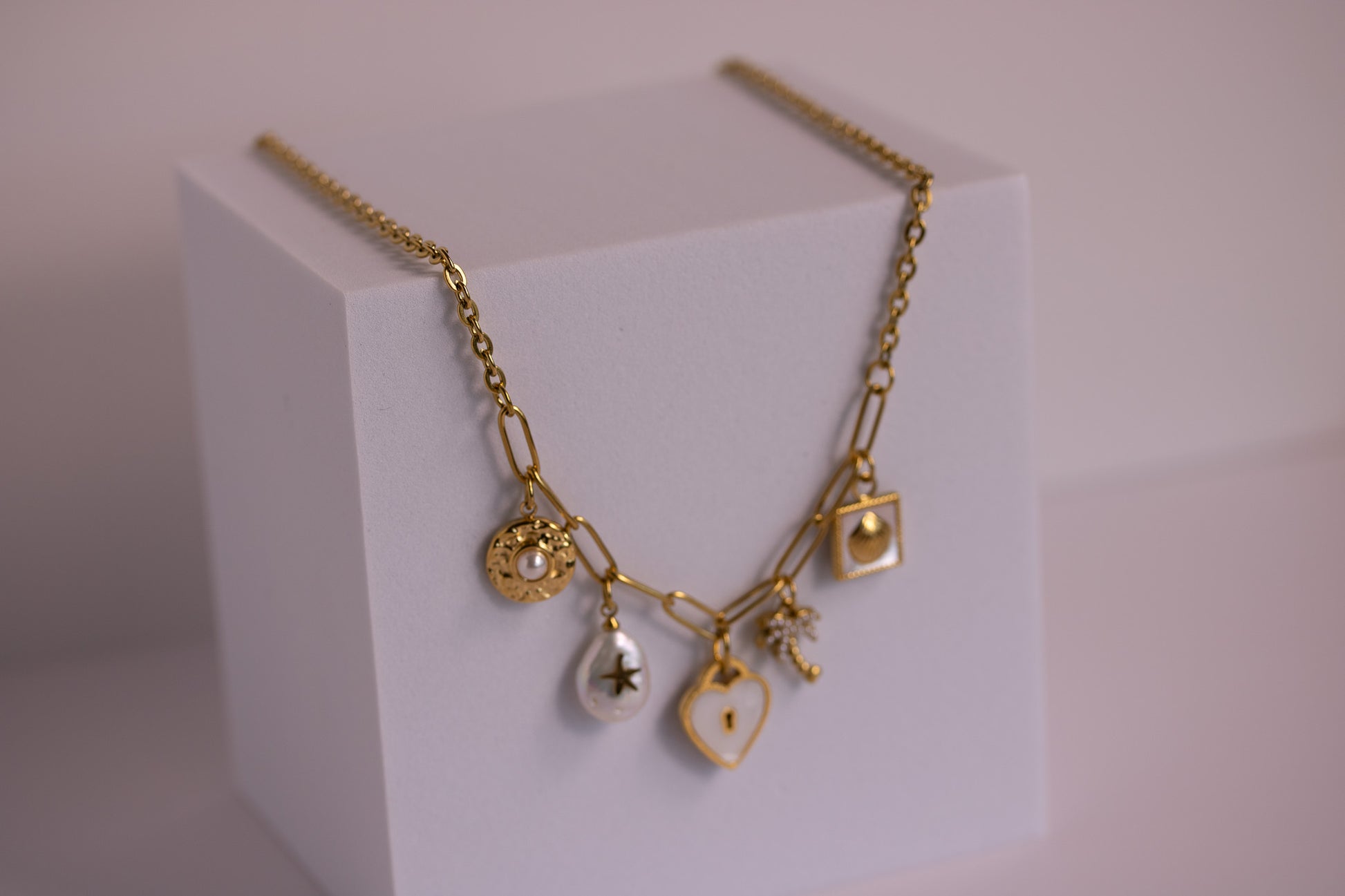 A playful curation of tiny treasures, lovingly gathered into one statement piece. The Starlit Coast Charm Necklace brings together a chain of elongated links with five charms: a beaded medallion set with a faux pearl, a shimmering pearl droplet etched with a starfish, a vintage heart lock, a delicate palm tree, and a square frame featuring a tiny shell. Each charm has its own whisper of story, creating a necklace full of whimsy and warmth.