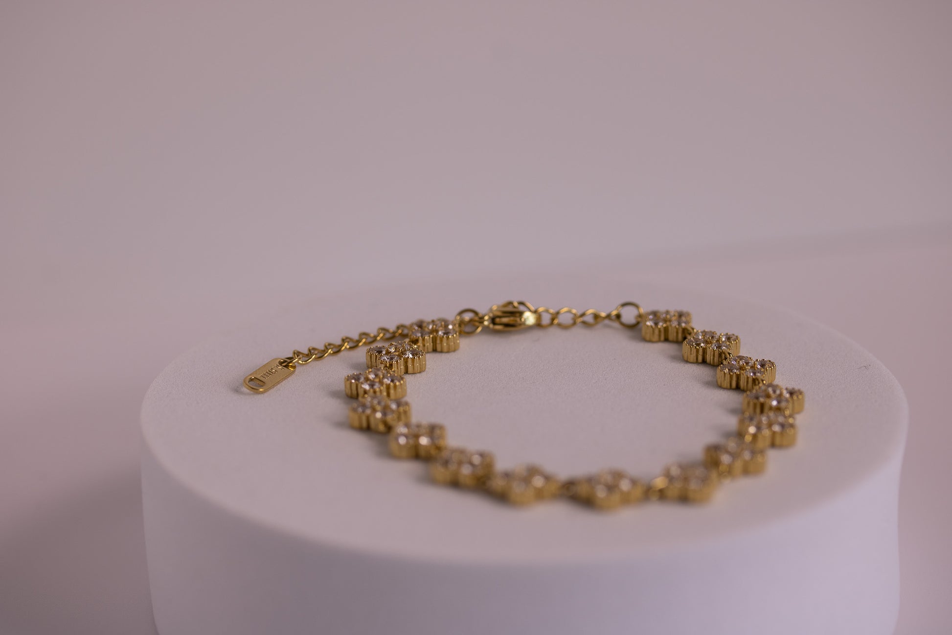 The Tidepetal Crystal Bracelet blends sculptural metalwork with petal-shaped, crystal-studded charms — creating a striking mix of shimmer and texture that feels refined, radiant, and unmistakably coastal. Each floral crystal link catches the light like glints on sunlit water, adding a delicate brilliance that elevates any everyday stack.