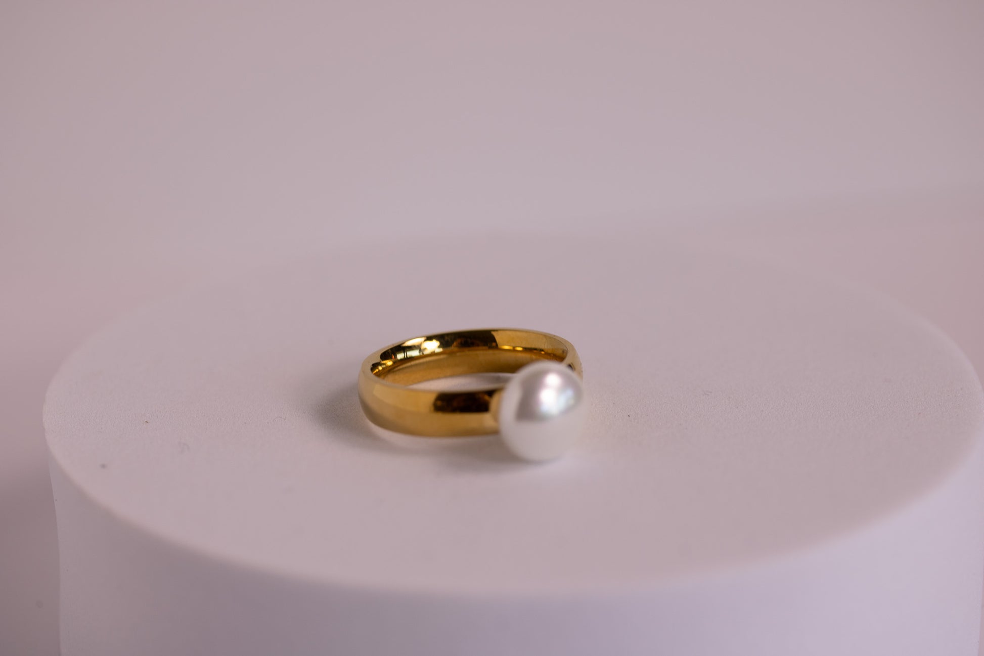Its smooth domed pearl sits atop a rounded band that feels comforting, weighty, and timeless — like a tiny moon resting on your hand. With gold and silver finishes to choose from, this ring adds a gentle shimmer that plays beautifully with both minimalist and coastal-inspired looks.