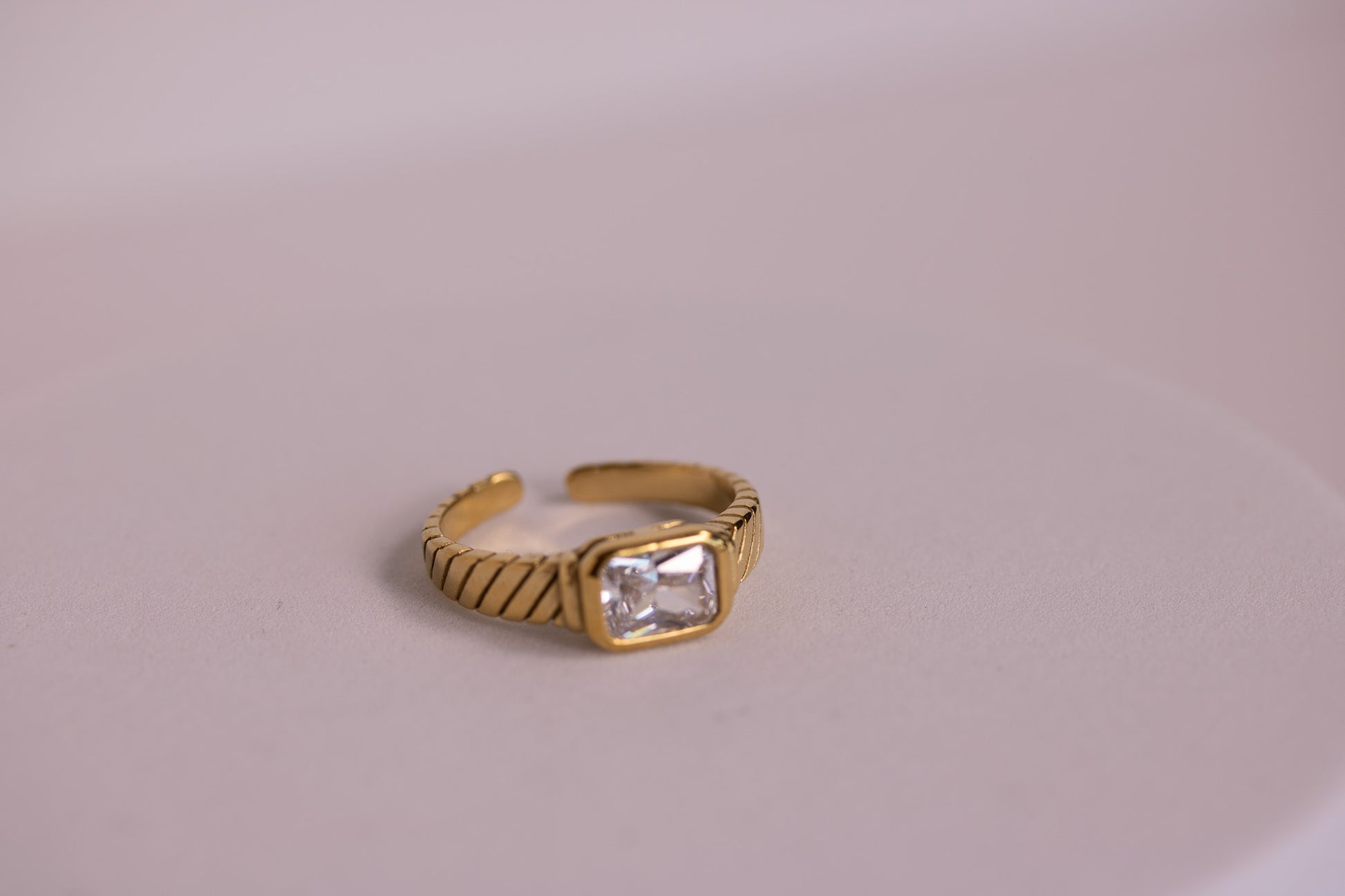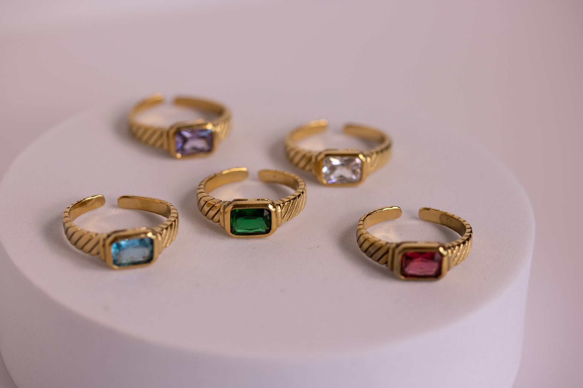 The Coastal Vintage Ring brings together a bold, faceted gemstone in a radiant rectangular cut, framed by a textured golden band inspired by windswept sand and tide-pressed patterns. Each ring glows in its own sunlit hue—emerald green, ocean blue, soft lilac, bright crystal, or coral rose—capturing the vibrant charm of treasures gathered along the shore.
