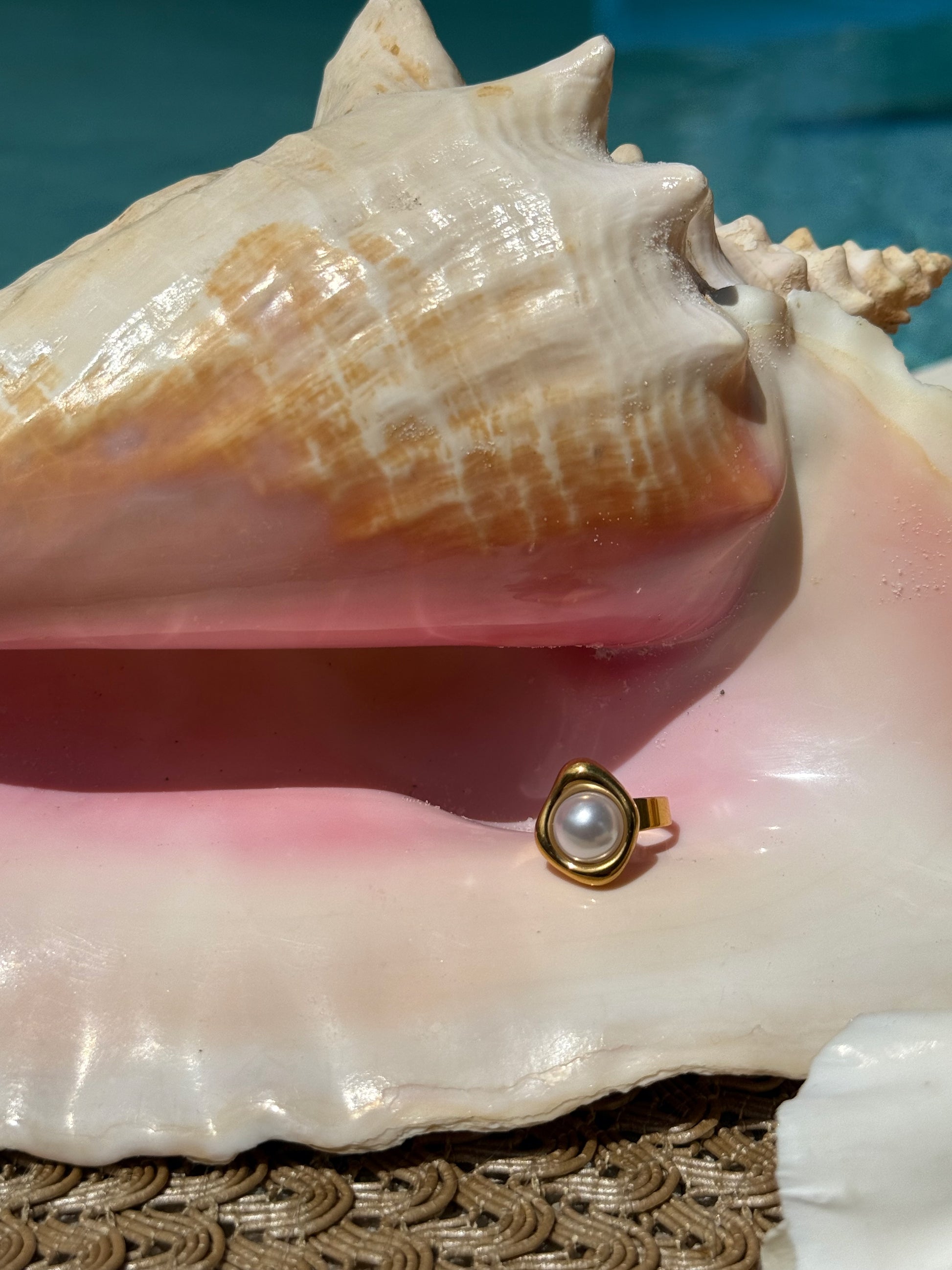 A imitation pearl cradled in a golden wave — simple, serene, and timeless like a calm shoreline at sunrise. This ring brings effortless coastal elegance, spotlighting a luminous pearl hugged by a smooth ripple of gold.
