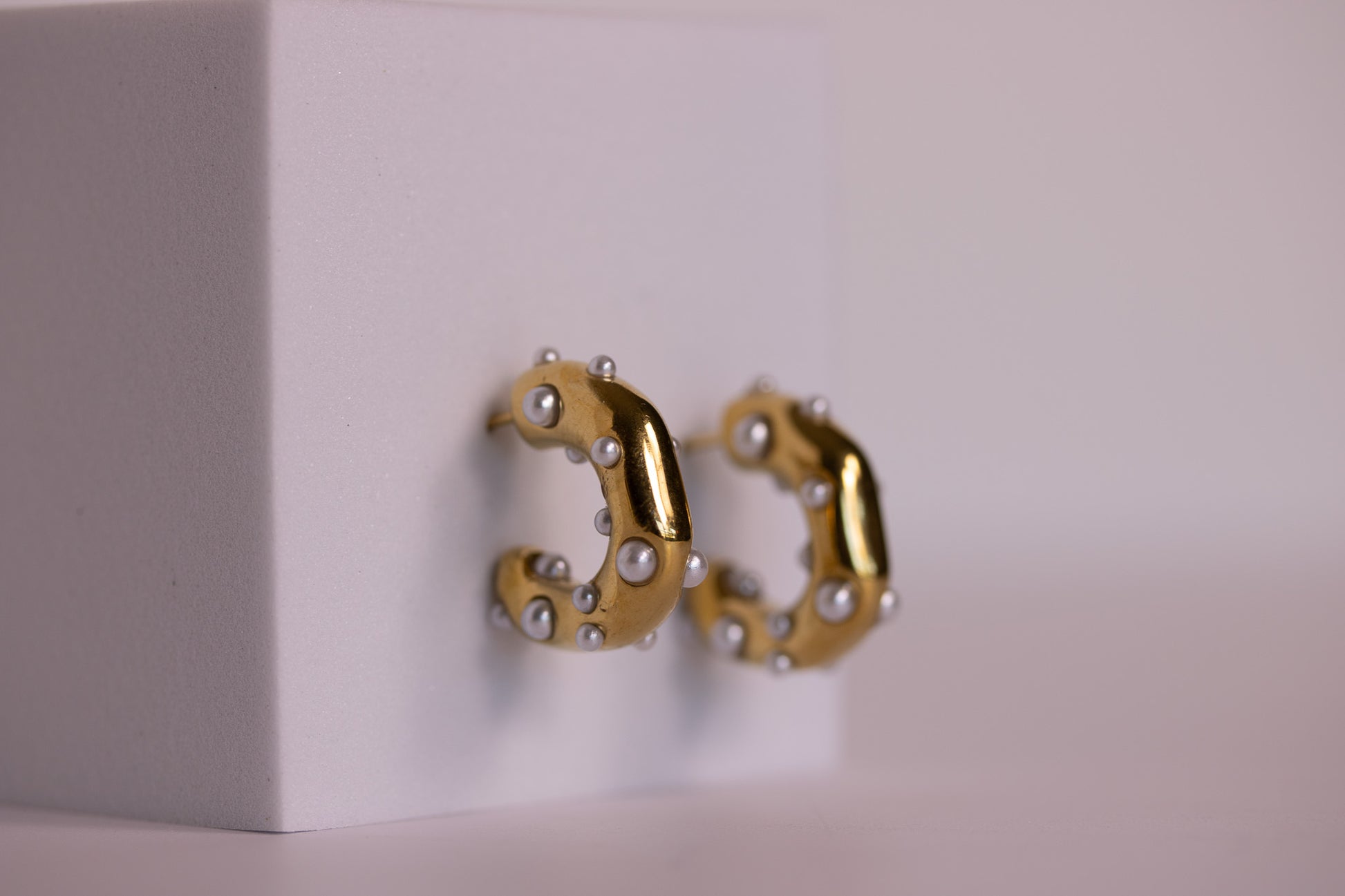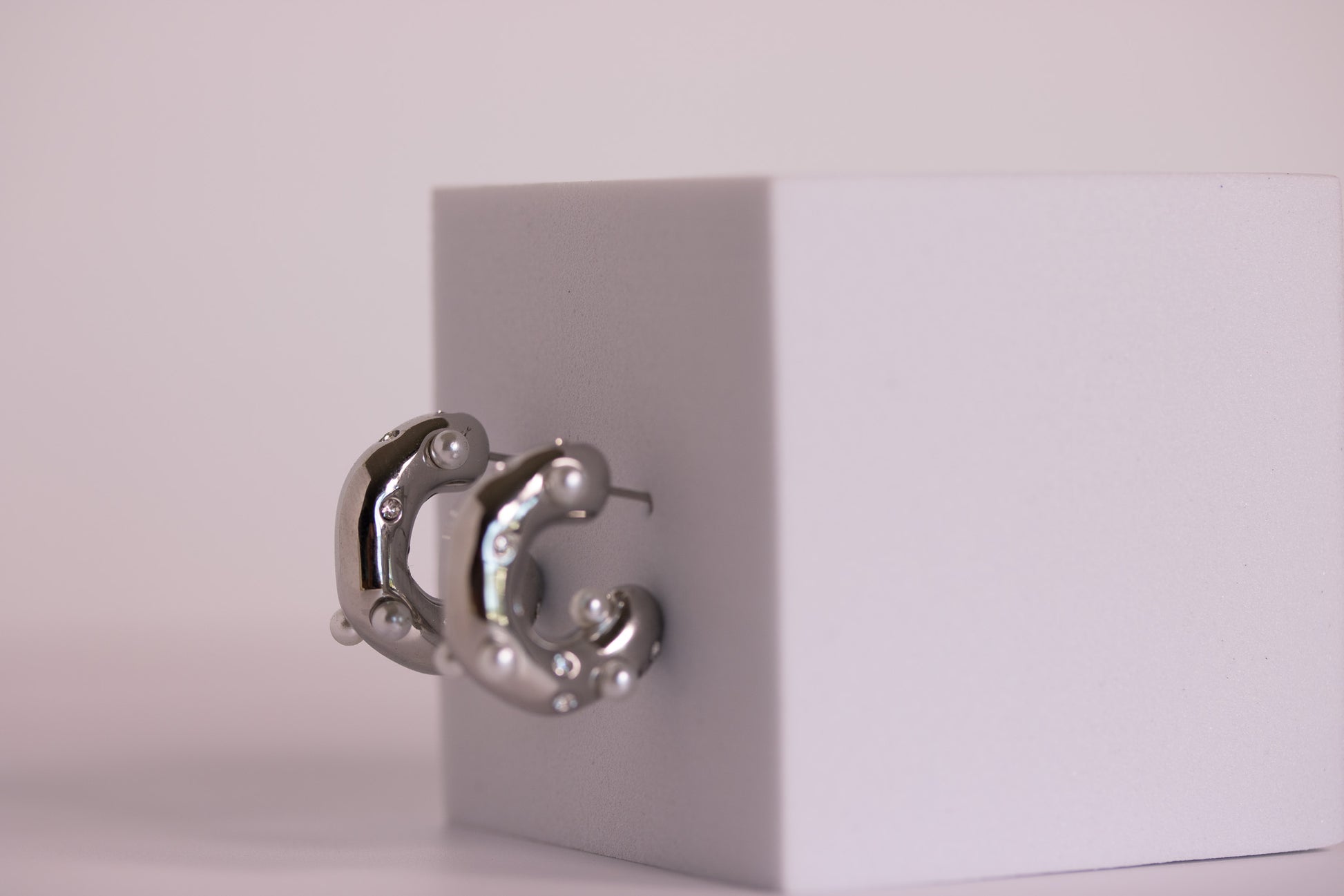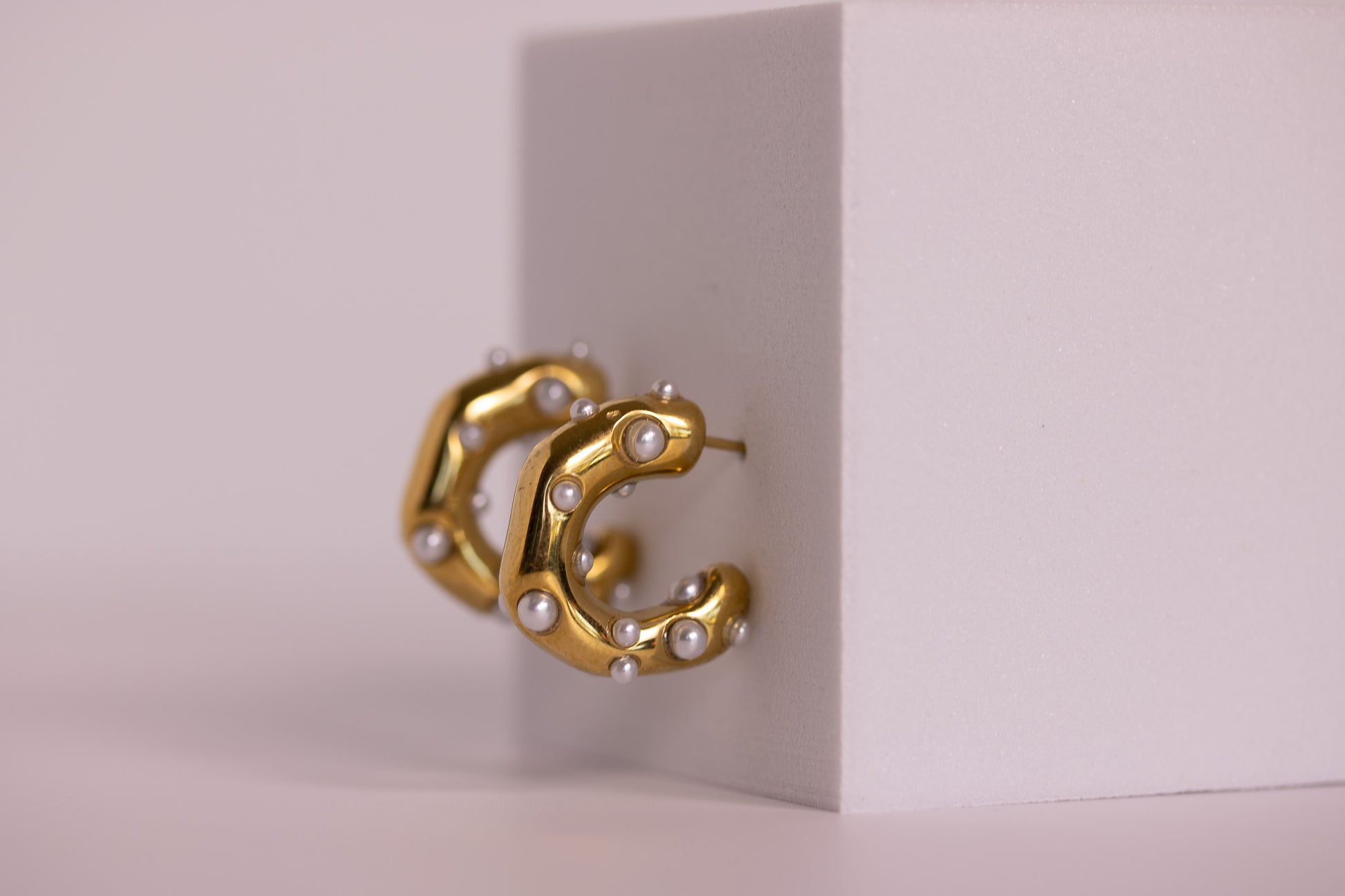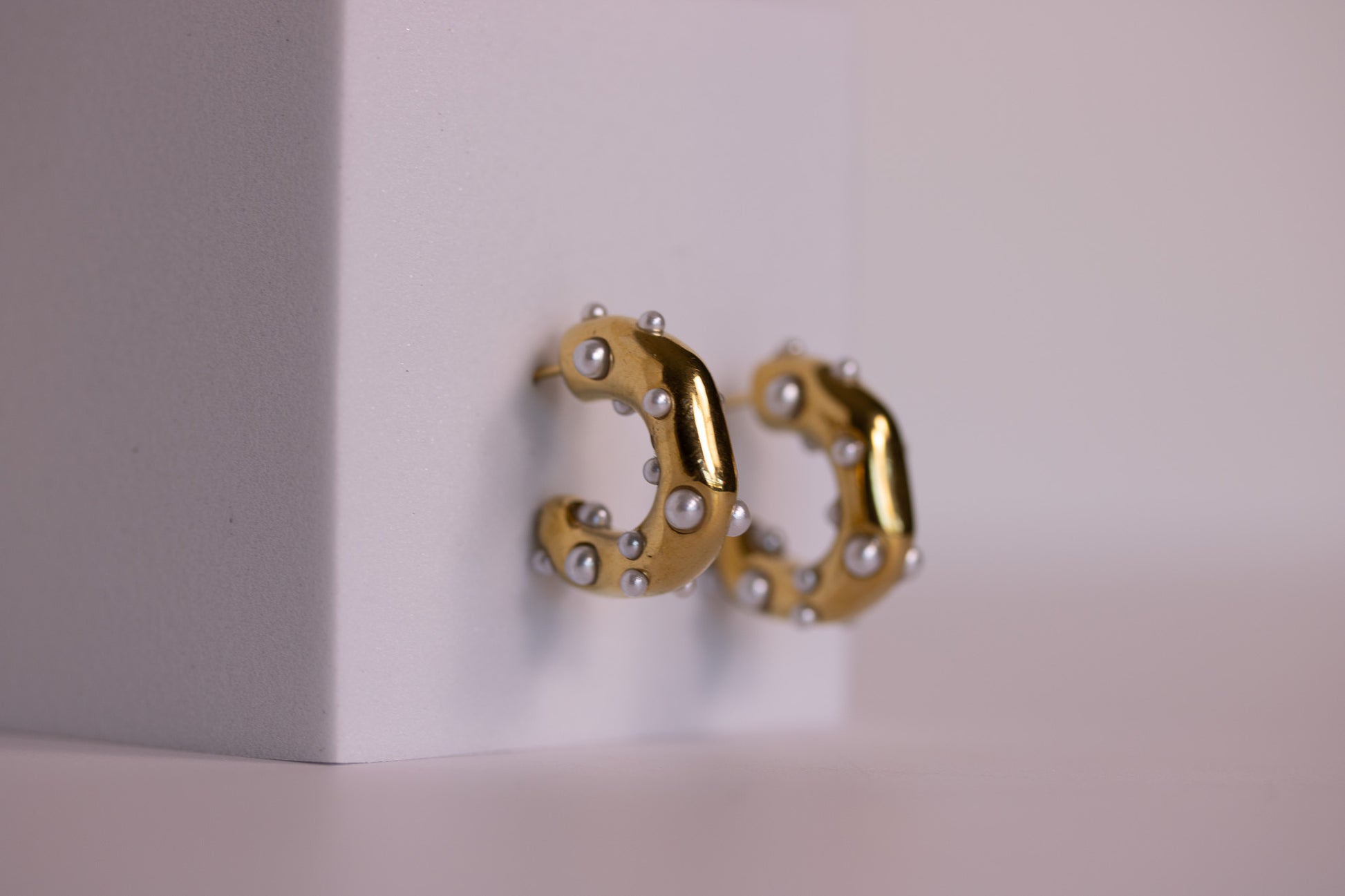 The Shimmer Crest Hoops in Pearl Glow feature a sculpted, wave-inspired silhouette accented with tiny pearl details that mimic sea foam catching the morning light. Available in both gold and silver finishes, each pair brings a soft, radiant glow that elevates any look — from everyday minimalism to evening shine.
