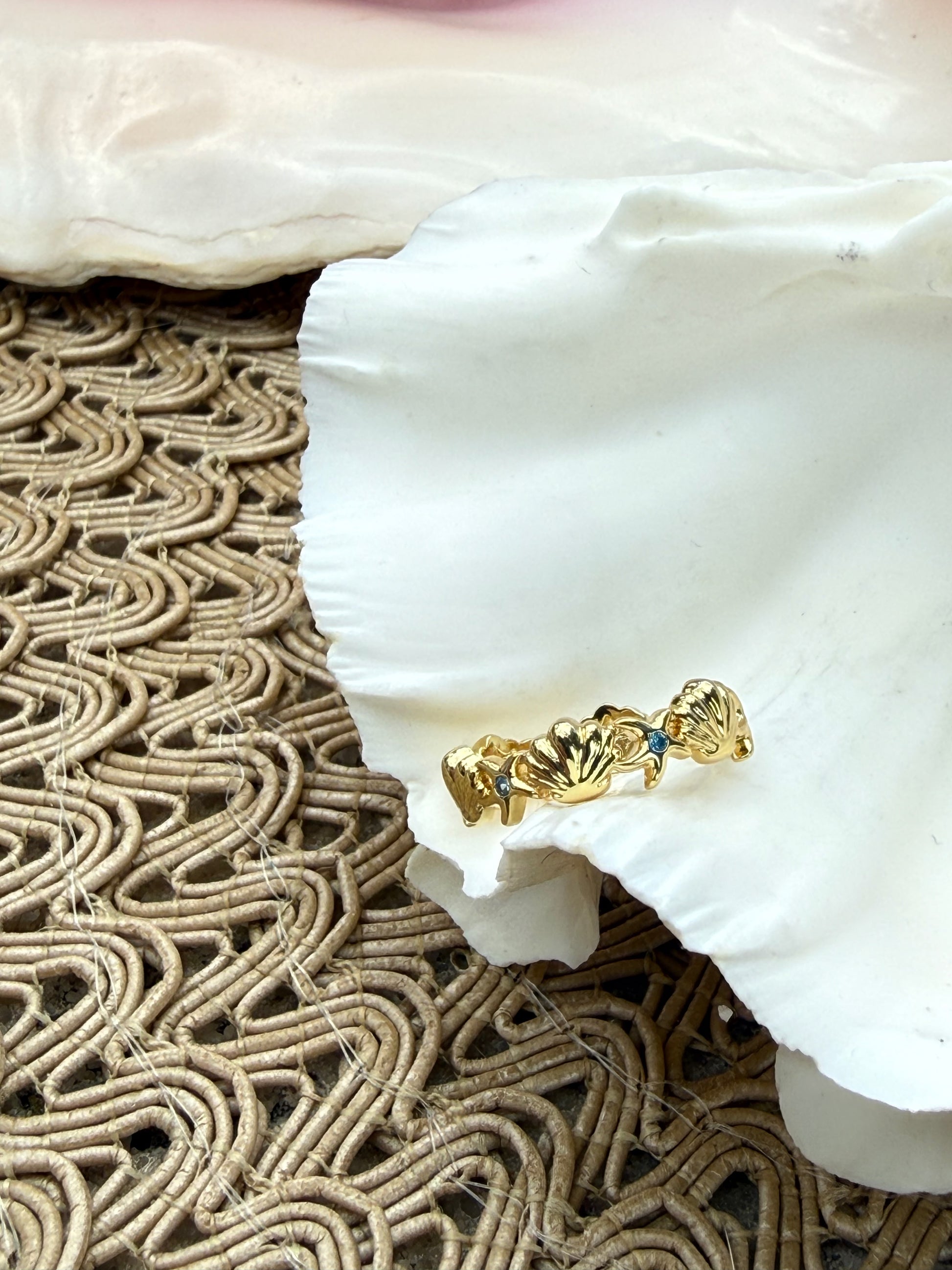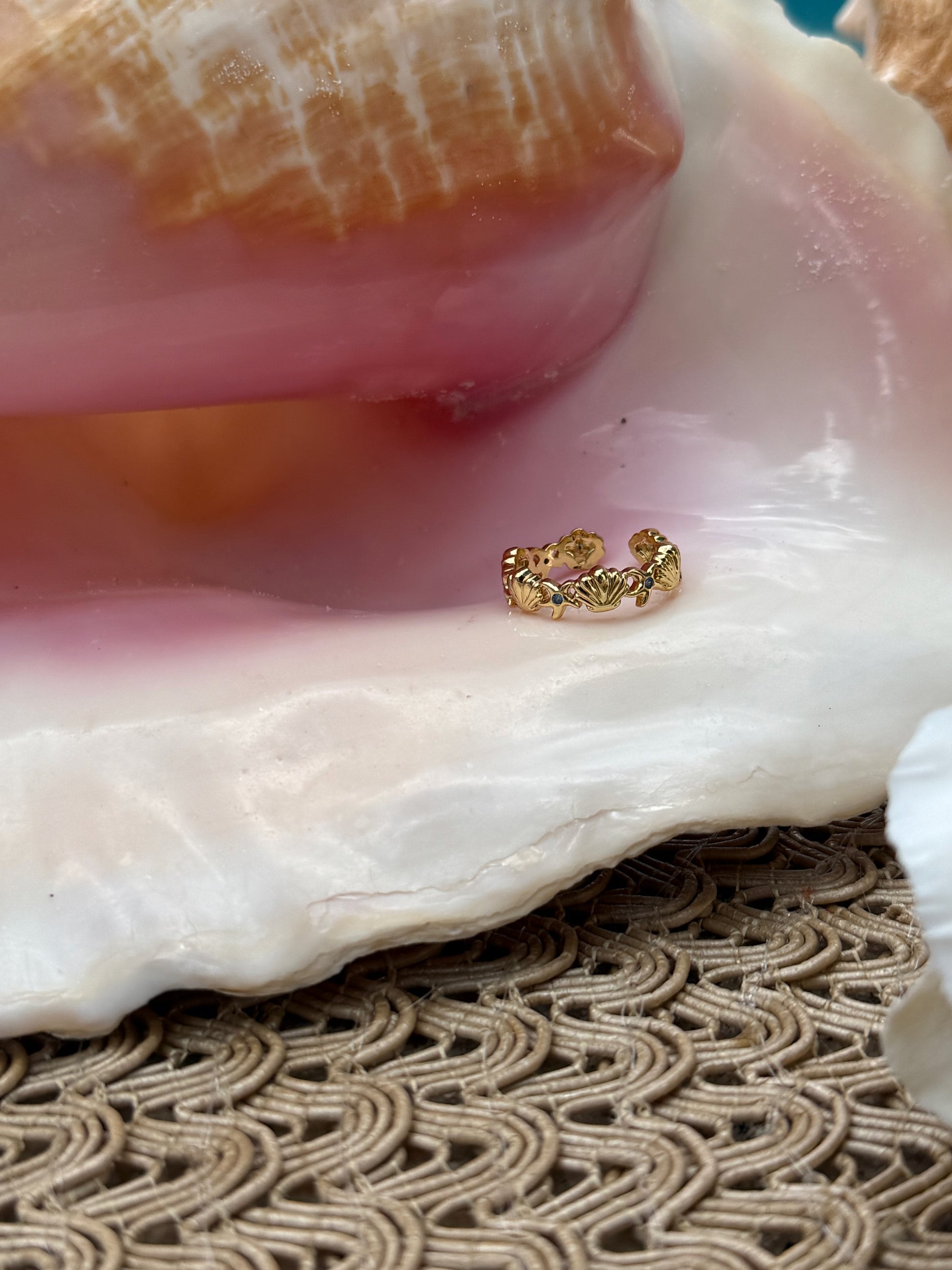 A wrap of golden shells and tiny starfish, accented with ocean-blue sparkle. Dreamy, whimsical, and full of coastal magic — like catching the light on a tide pool at sunrise.