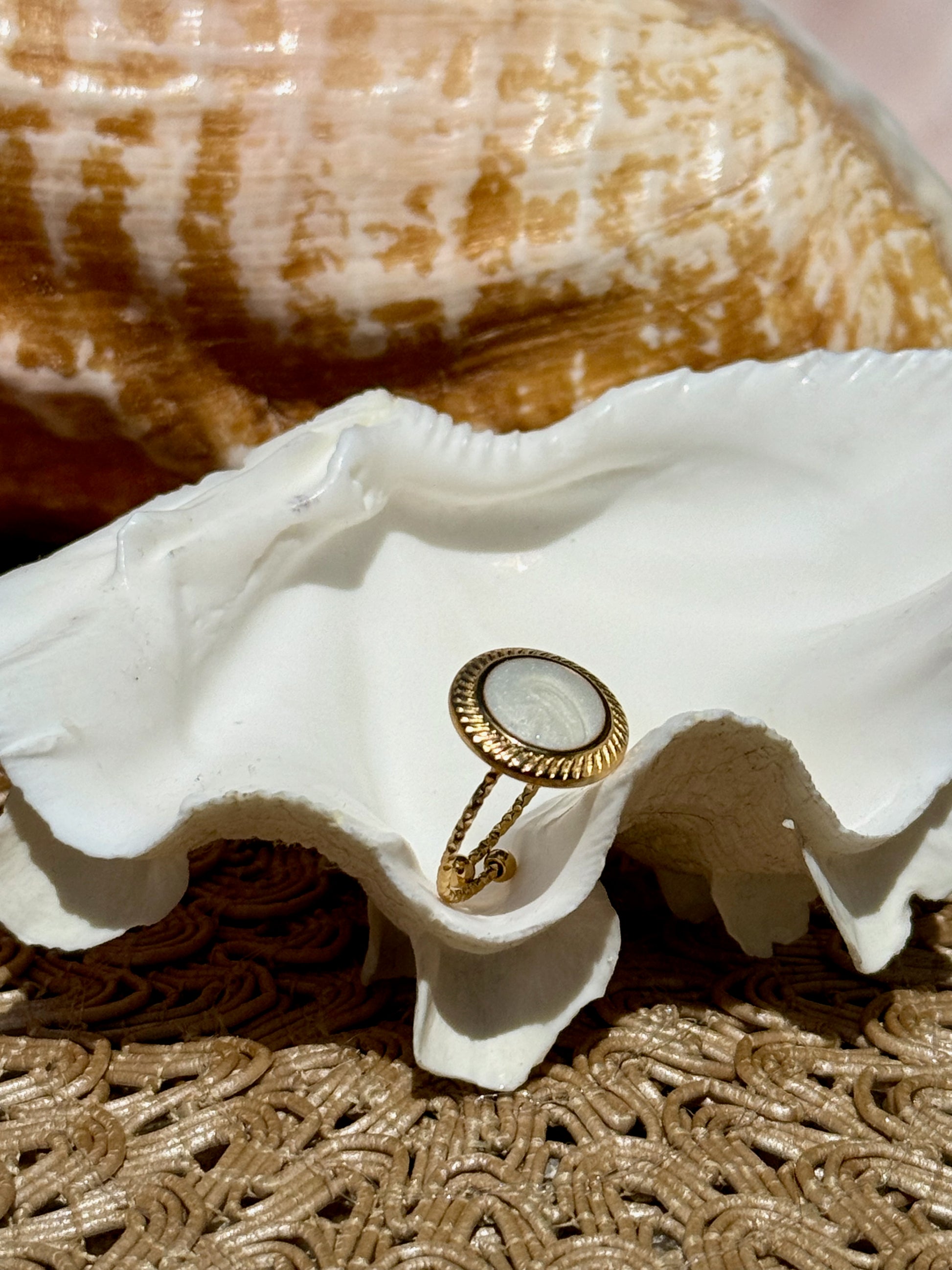 This oval shell ring captures the softness of ocean foam + sunlit shorelines. A milky white shell sits inside a golden beaded frame, paired with a textured adjustable band that feels like ripples along the sand.