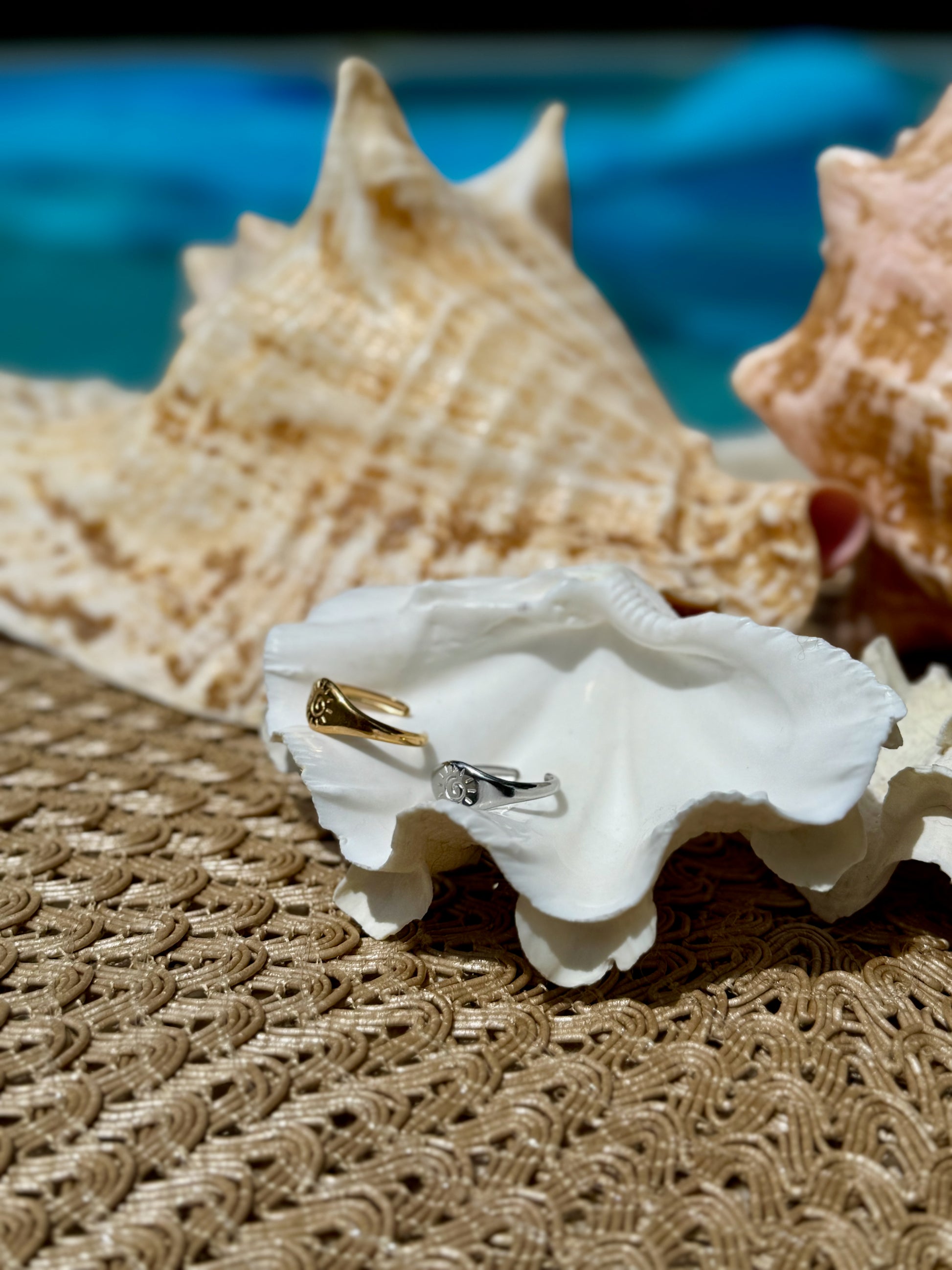 A tiny sunburst design shines atop this dainty wrap ring — a sweet reminder of warm beach mornings, salt-kissed skin, and slow coastal days. Available in gold or silver, it’s the perfect everyday piece for stacking or wearing solo.