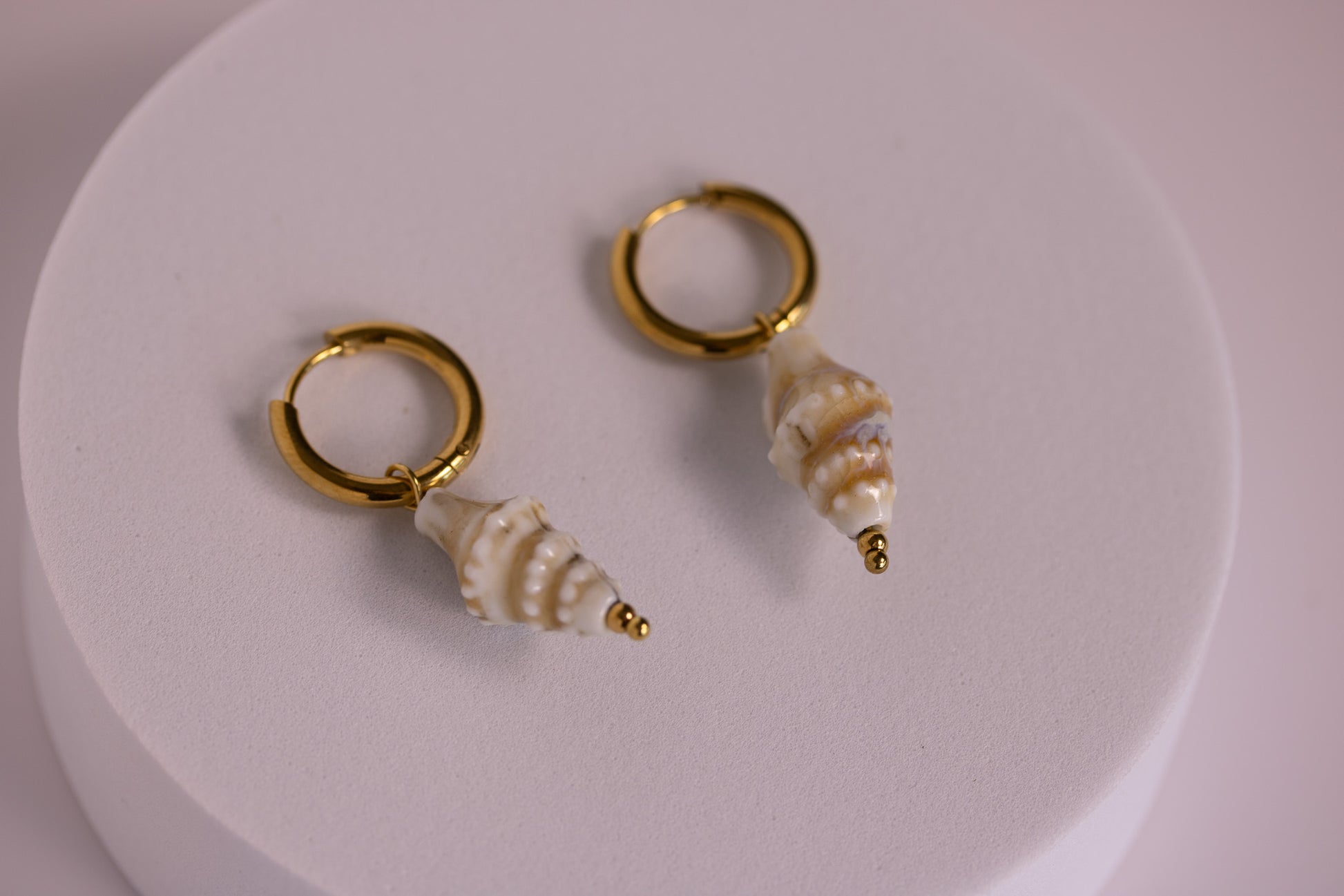 Playful and colorful, these ceramic seashell charms dangle from golden hoops, bringing a touch of the shoreline to your style. Available in green, pink, and blue, each charm is surprisingly lightweight for all-day comfort—designed to shine without weighing you down.