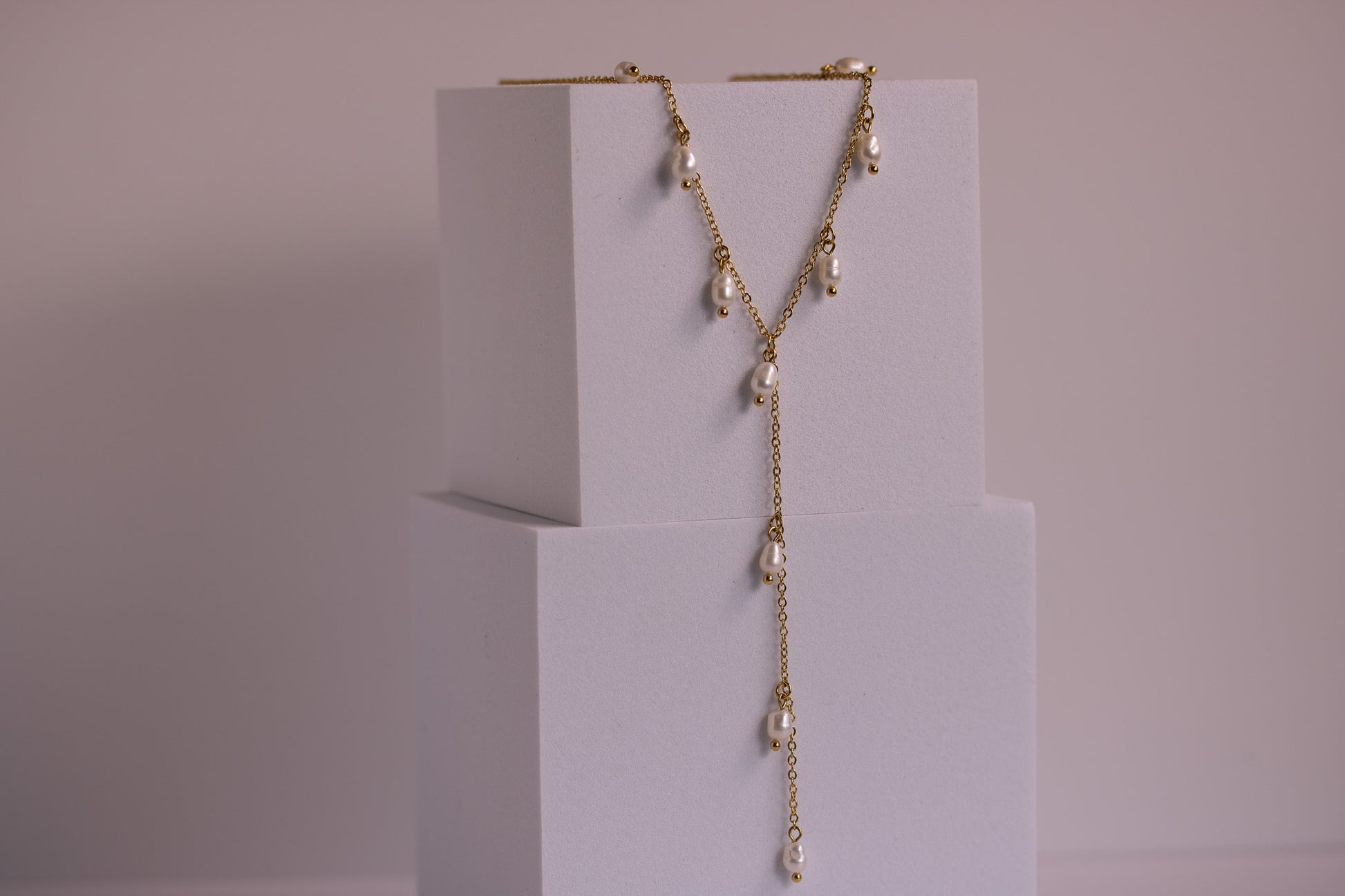 A cascade of ocean-kissed elegance. The Shoreline Drip Pearl Necklace features a flowing lariat silhouette adorned with tiny freshwater pearls that shimmer like droplets catching the last light of golden hour. Each pearl sways gently with movement, creating a dreamy, elongated look that flatters every neckline — from everyday tanks to dressy coastal evenings.