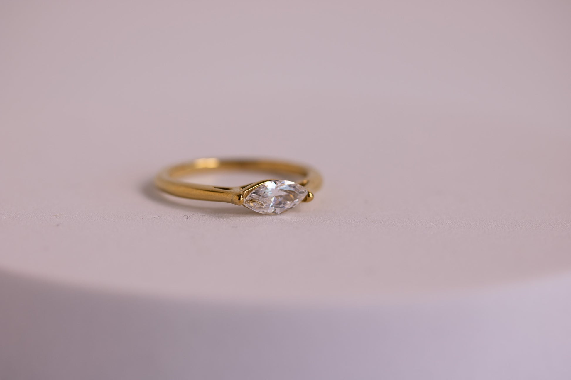 Its marquise-cut stone reflects light like a ripple across the water, set in a smooth, minimalist band that feels effortlessly refined from every angle.