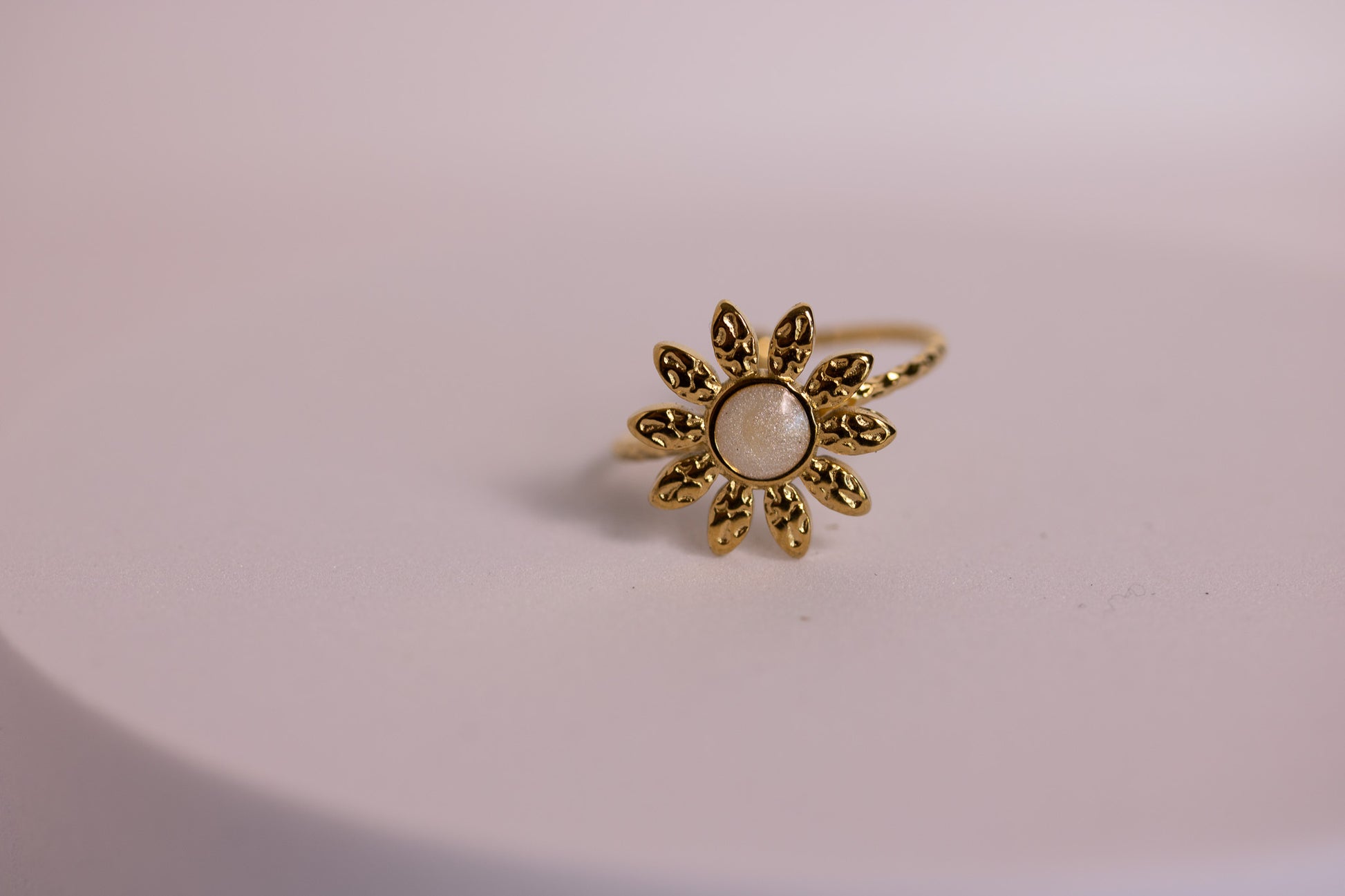 The Lotus Ring blooms with a radiant, mother-of-pearl inspired center framed by delicately sculpted golden petals—capturing the serene, uplifting beauty of a sunlit lotus in full bloom. Its glossy, luminous finish reflects soft light with every movement, while the raised petal detailing brings an elegant, nature-inspired touch. With a gently adjustable band, it offers a comfortable, effortless fit for everyday wear.