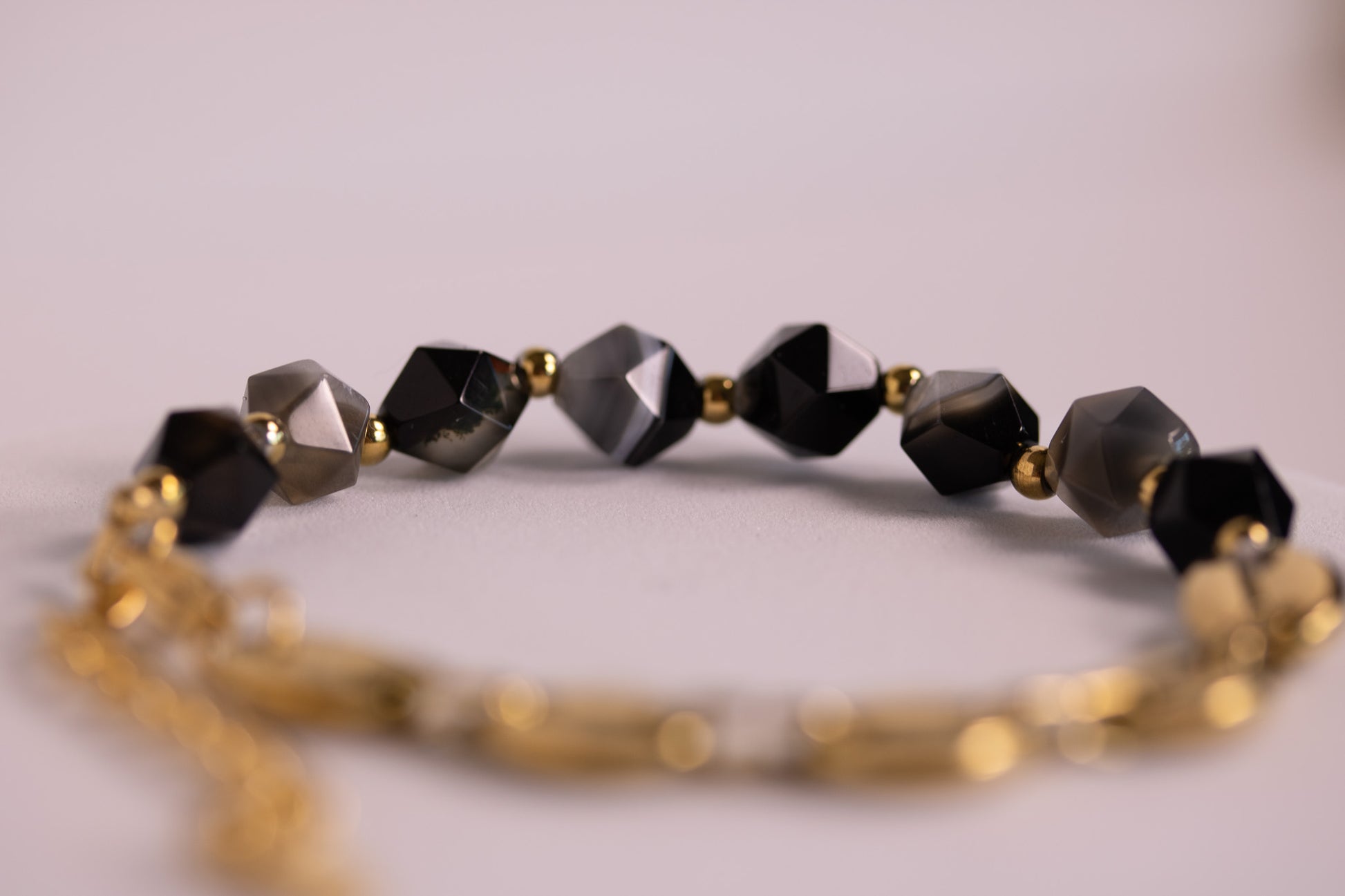 Meet the Midnight Current Bracelet — a moody, coastal-inspired piece that blends glossy black-and-gray faceted beads with a radiant golden chain. The contrast feels like waves meeting moonlit water — bold, sleek, and effortlessly elevated.