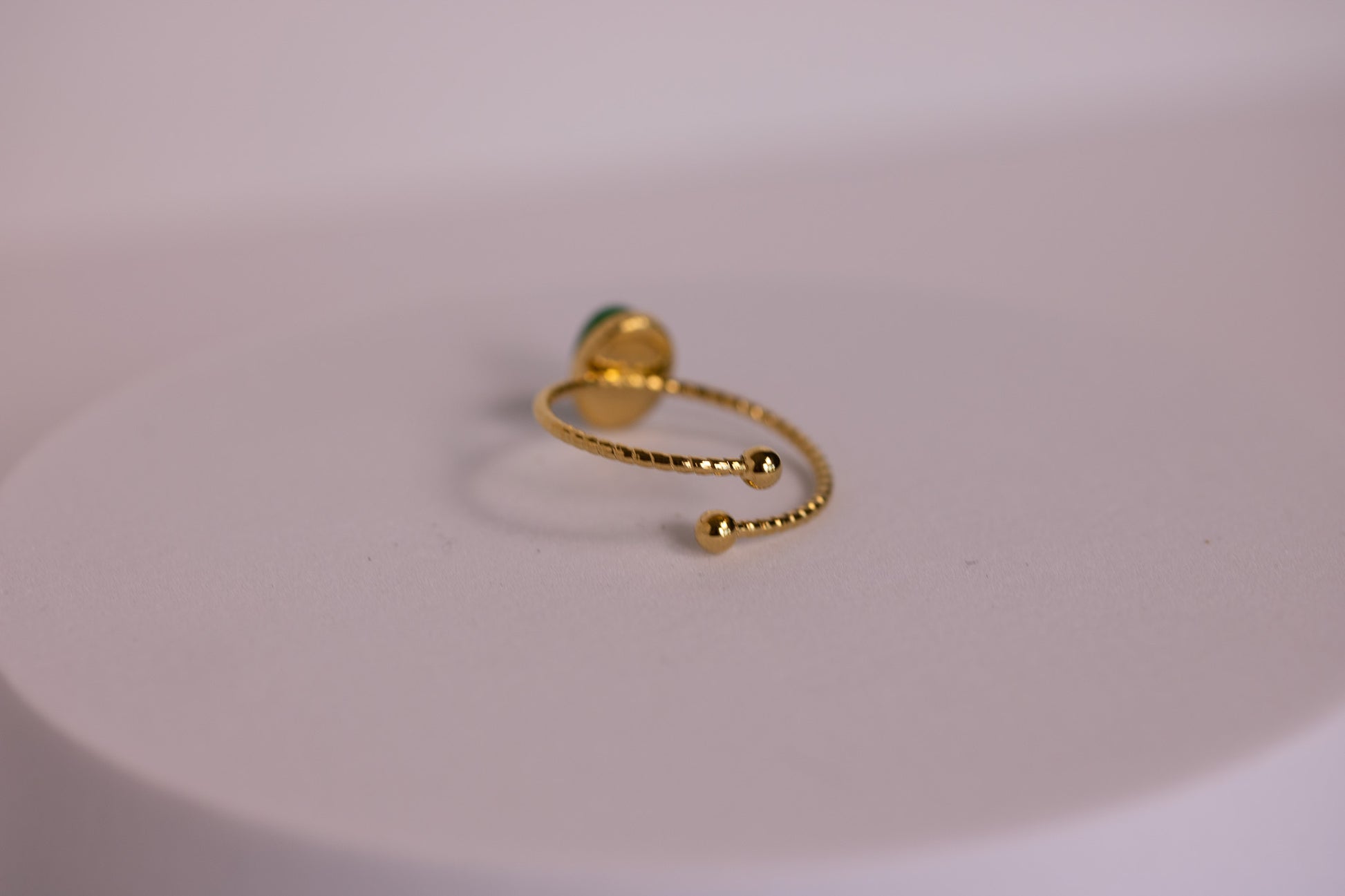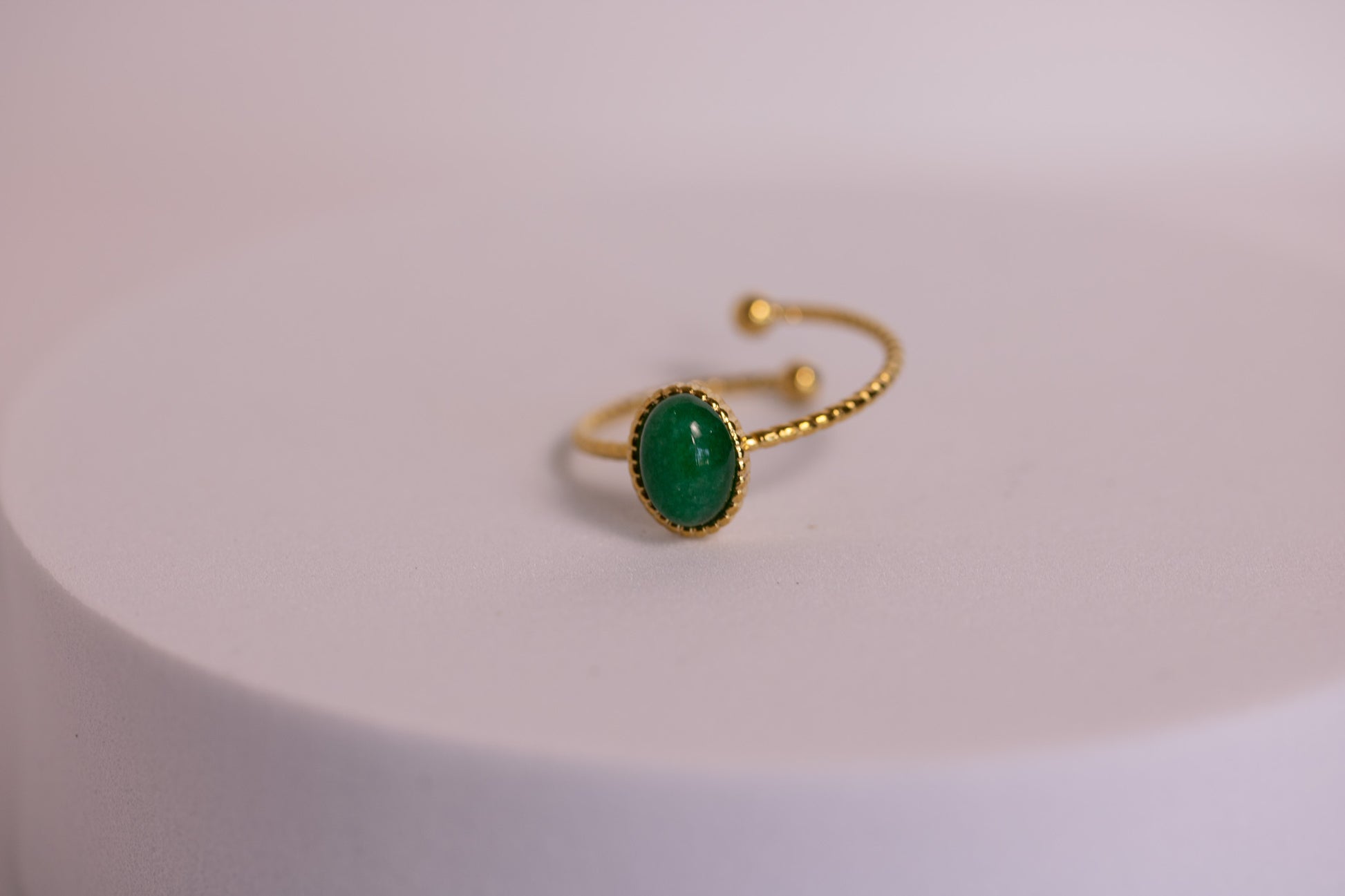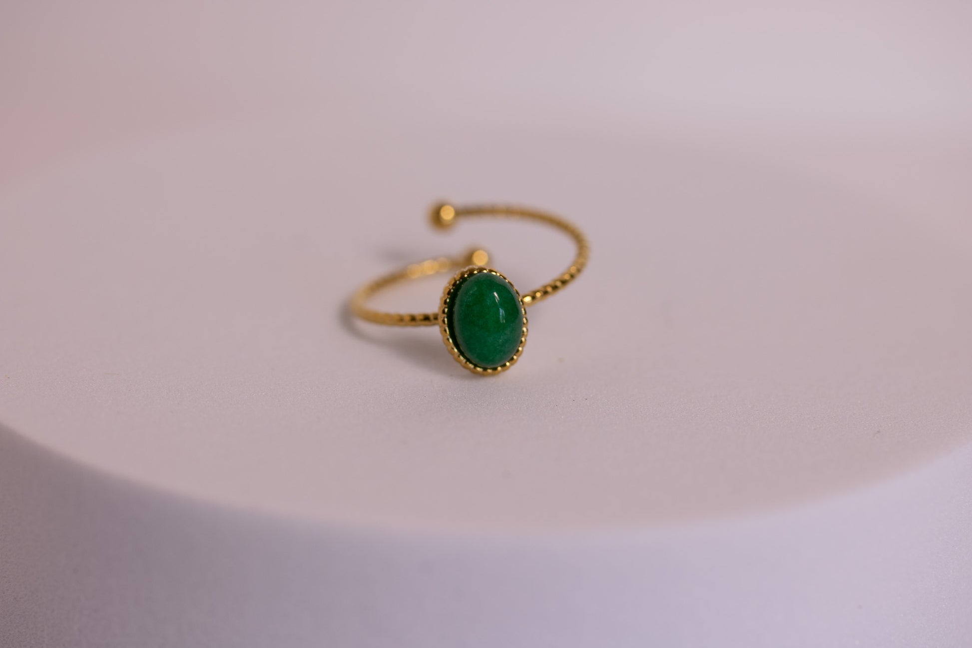 The Moss Bay Ring captures the calming, earthy beauty of coastal greens with its rich oval gemstone set in warm, polished gold. The stone’s deep, natural hue brings a peaceful, grounded energy, while the gently beaded band adds a touch of delicate texture. Designed with an open, wraparound silhouette, this ring feels airy, modern, and effortlessly elegant.