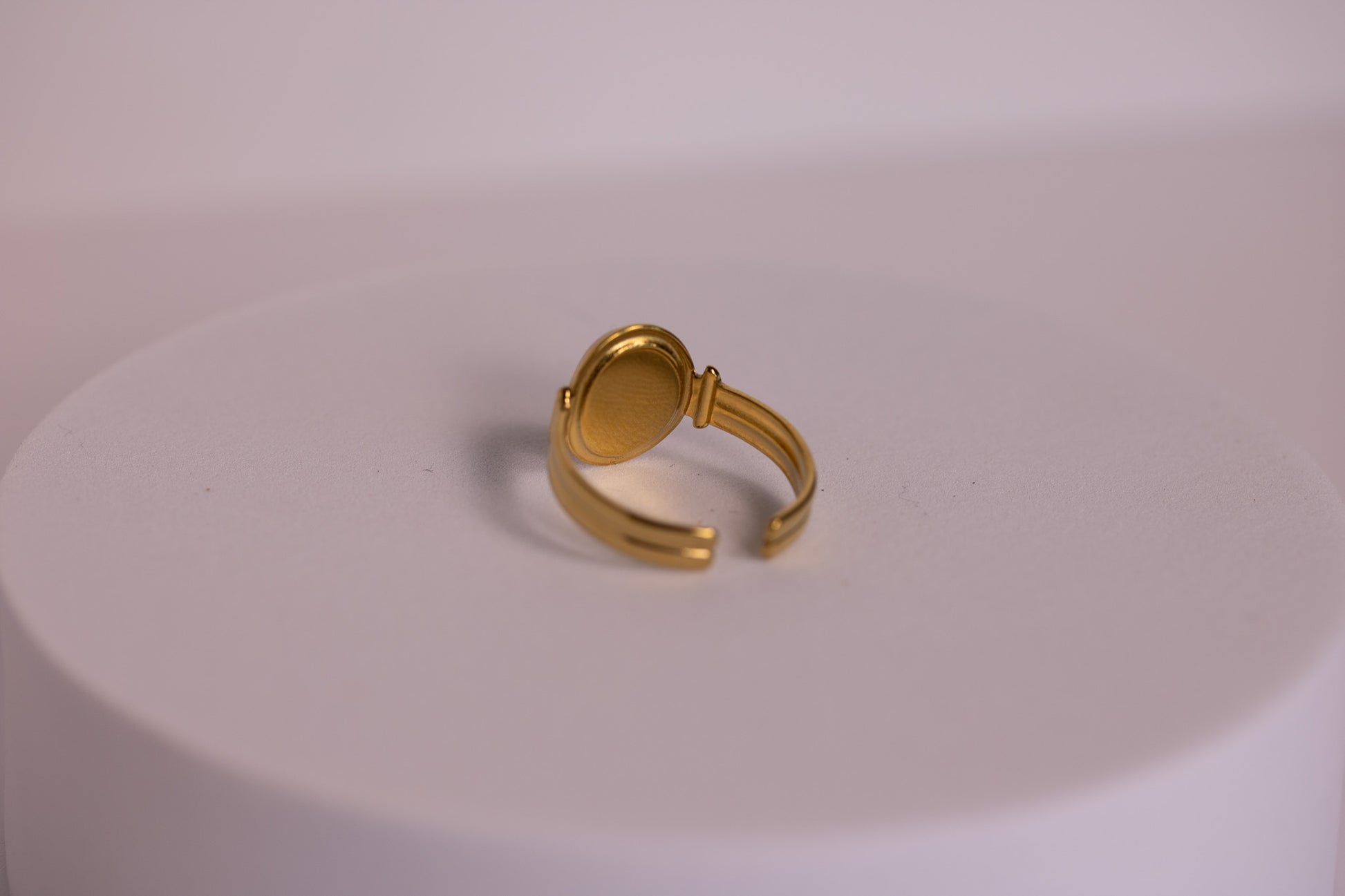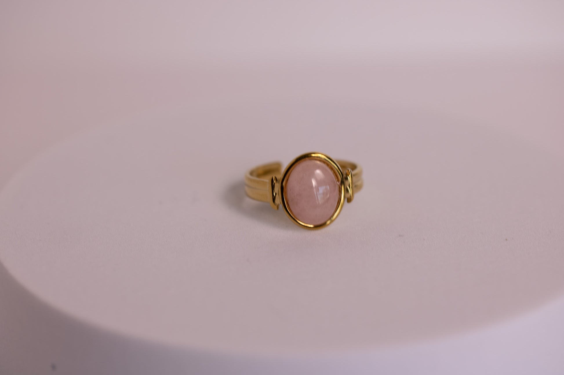 The Mira Coast Ring captures the soft, dreamy glow of shoreline sunsets with its smooth blush-pink stone set in warm, polished gold. The round cabochon center reflects light with a gentle, luminous sheen, while the minimal bezel frame adds a touch of vintage-meets-modern elegance. Its open-band design offers an airy, effortless feel—comfortable for everyday wear and perfect for adding a hint of rosy warmth to your stack.