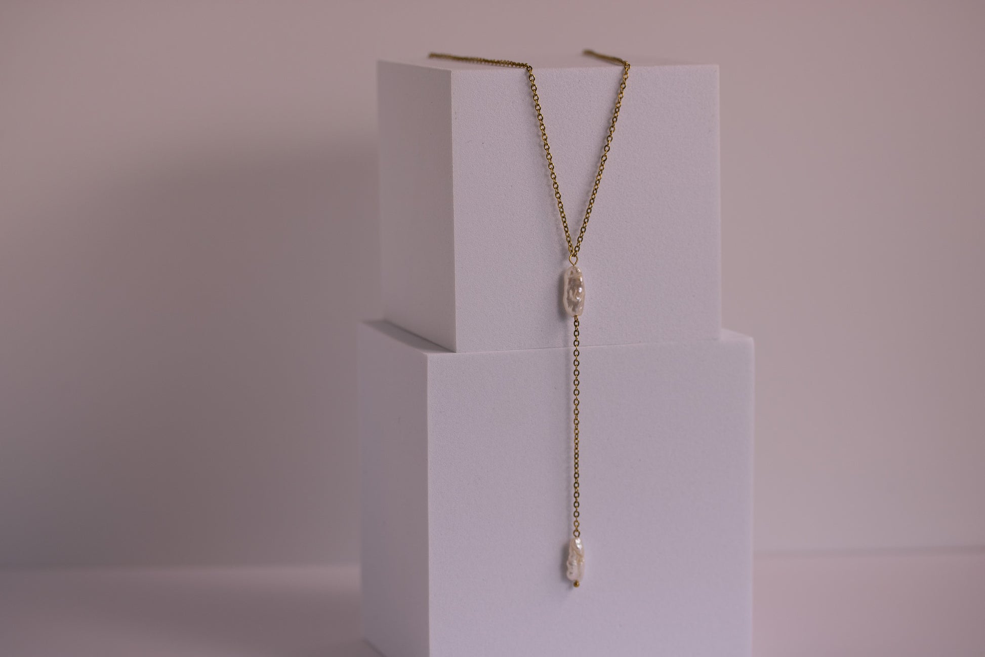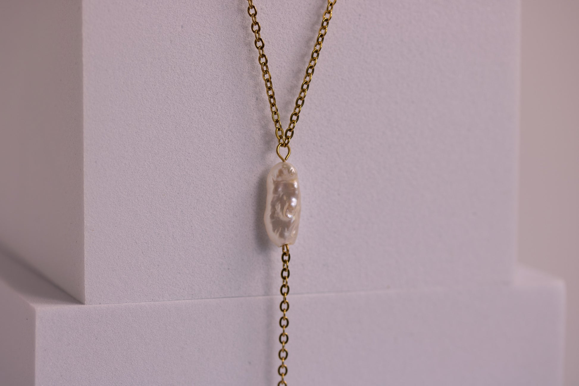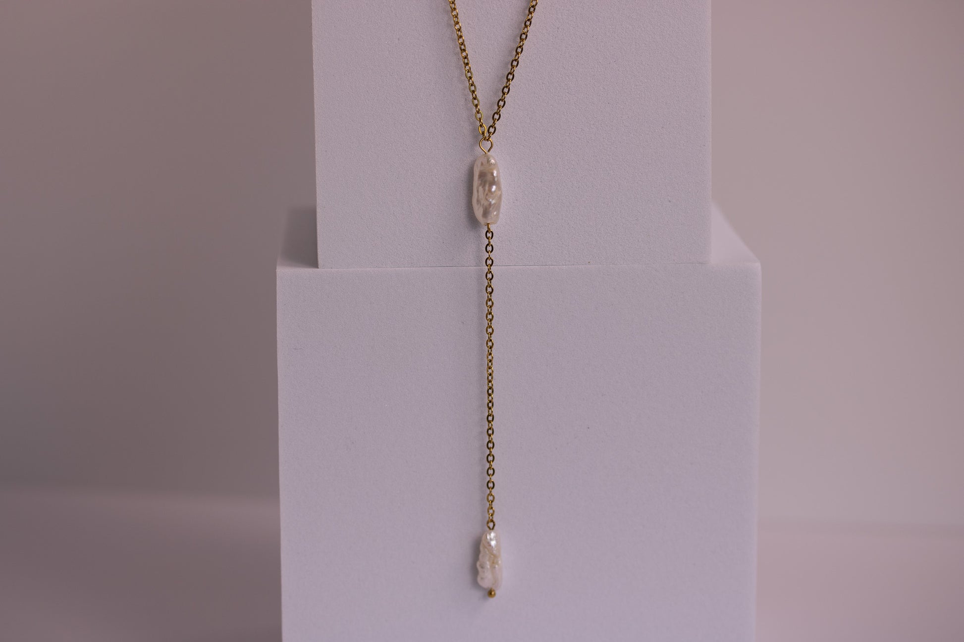 Soft moonlit shimmer, shaped into a clean, modern drop. The Luna Drip Lariat Necklace features two natural baroque pearls — each one unique, organic, and full of quiet glow. Suspended along a sleek gold chain, the pearls create a graceful vertical line that lengthens the neckline and brings a touch of effortless coastal luxury to any outfit.