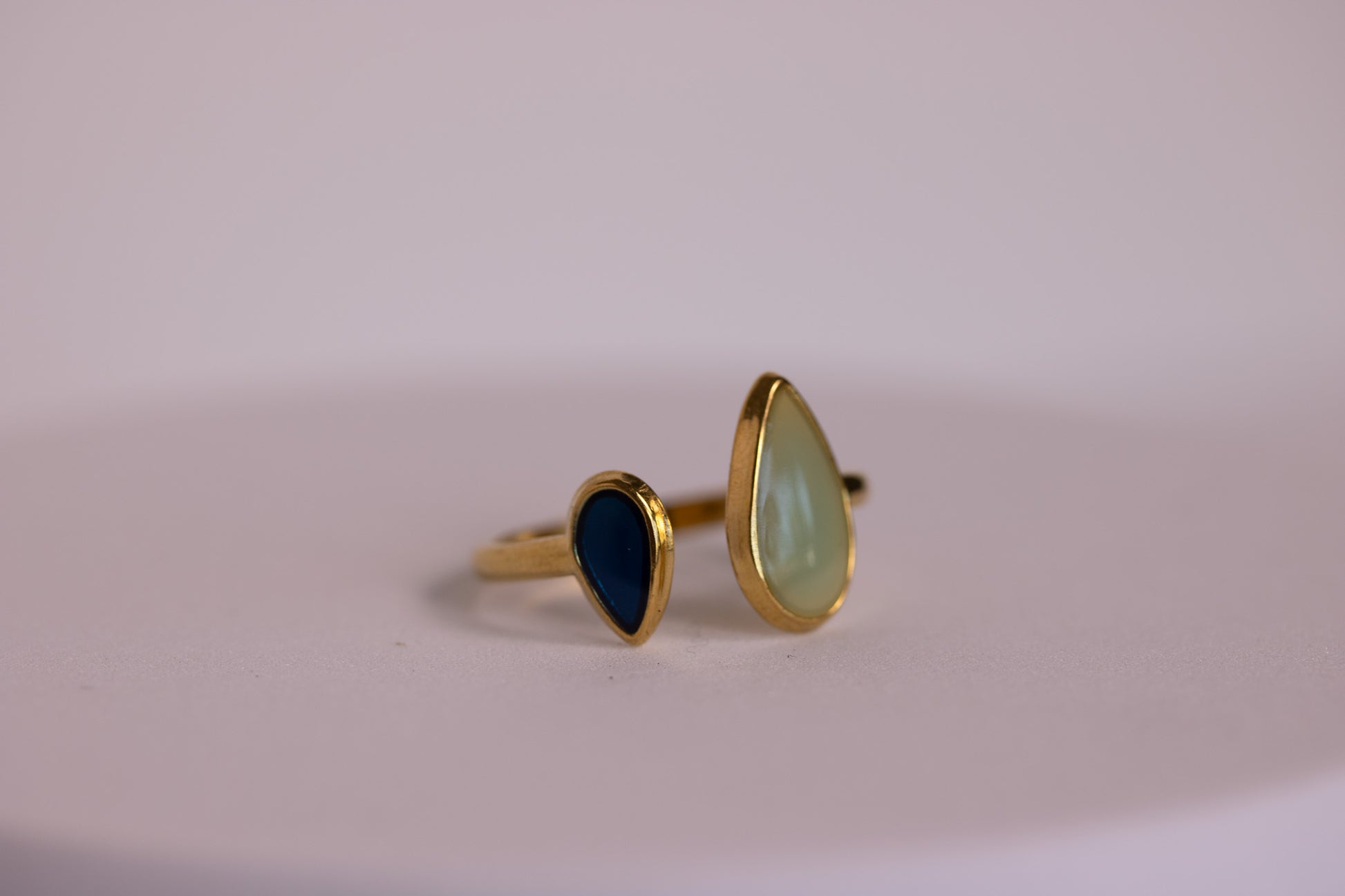 The Reef Ring pairs two teardrop stones—one deep and ocean-dark, the other soft and sea-glass pale—capturing the shifting hues of the shoreline. Its open-band design creates a modern, fluid silhouette that feels both minimal and boldly coastal.