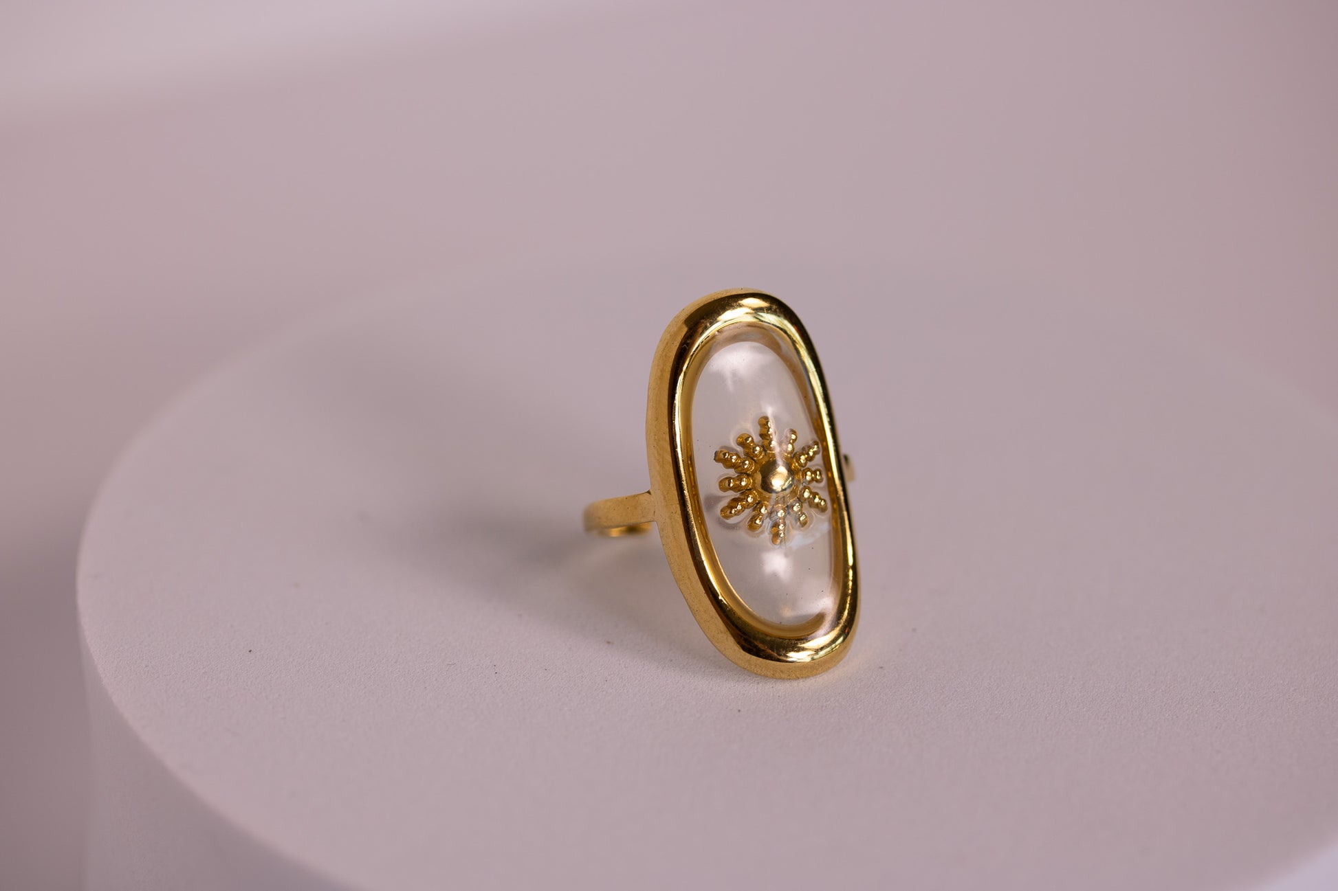 The Sunbubble Ring features a smooth, pearly center framed by a raised golden sunburst—radiating warmth with every turn. Its elongated silhouette feels both modern and timeless, like a sunbeam captured inside polished gold. The soft oval shape and detailed rays create a luminous, light-catching moment that brightens any stack.