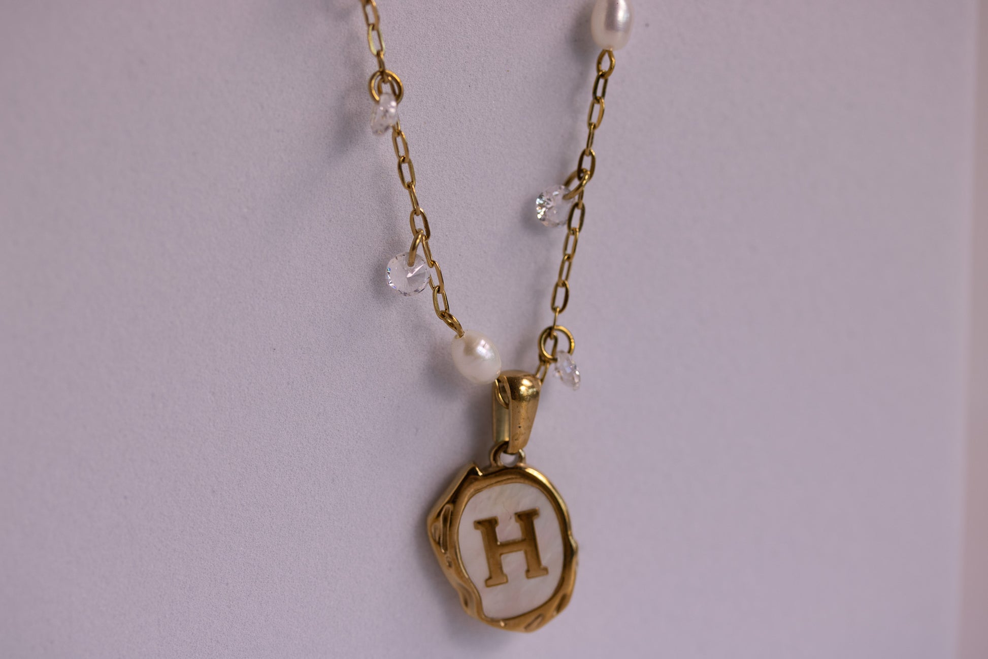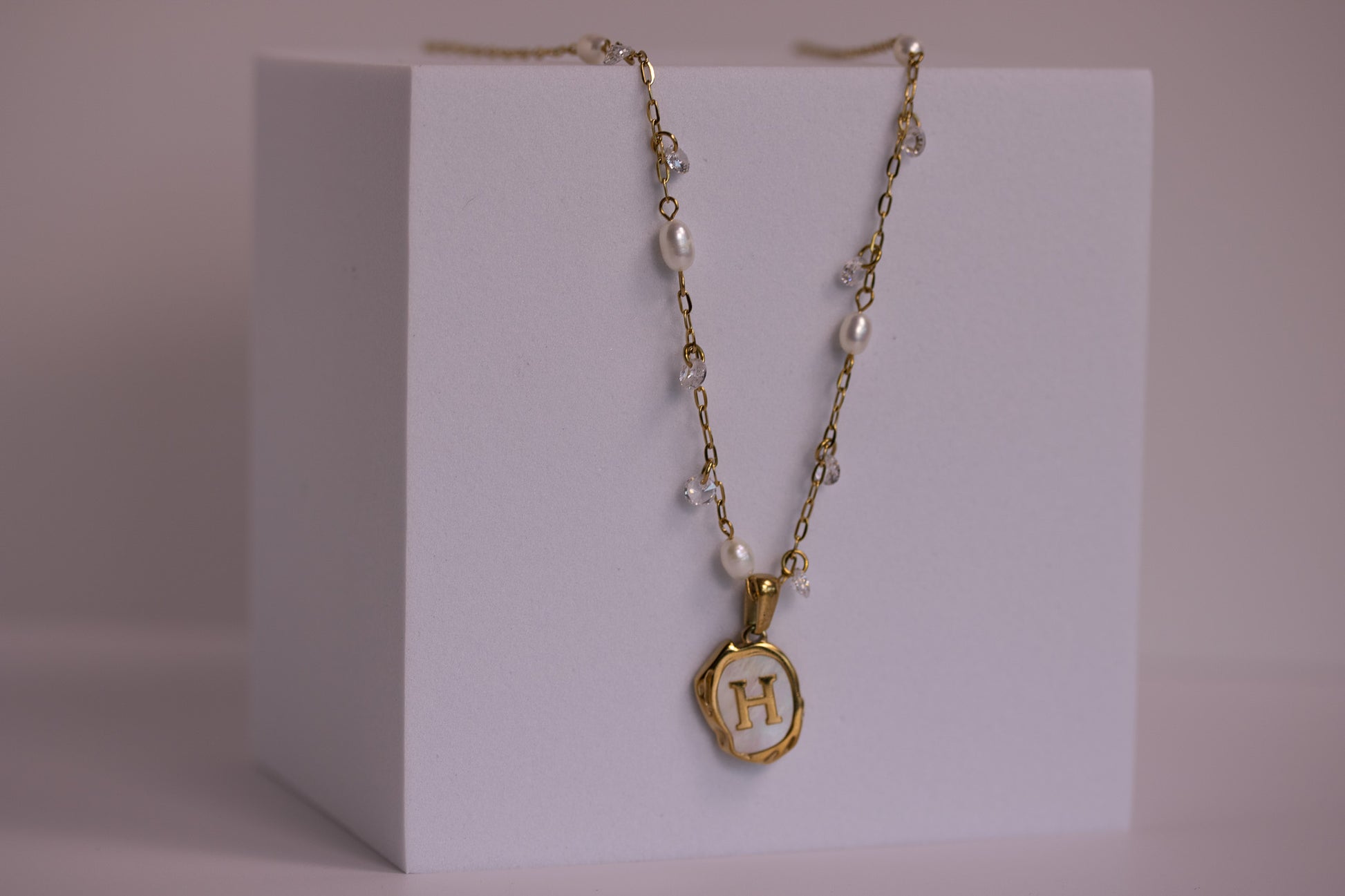 A soft shimmer of coastal charm, captured in every tiny pearl and crystal along the chain. The Dancing Pearls Seaside Initial Necklace features a golden initial pendant set in an organic wax-seal style frame — a keepsake-inspired piece that feels both personal and timeless. Each freshwater pearl adds a touch of ocean-born elegance, making it a meaningful everyday staple or the perfect gift.