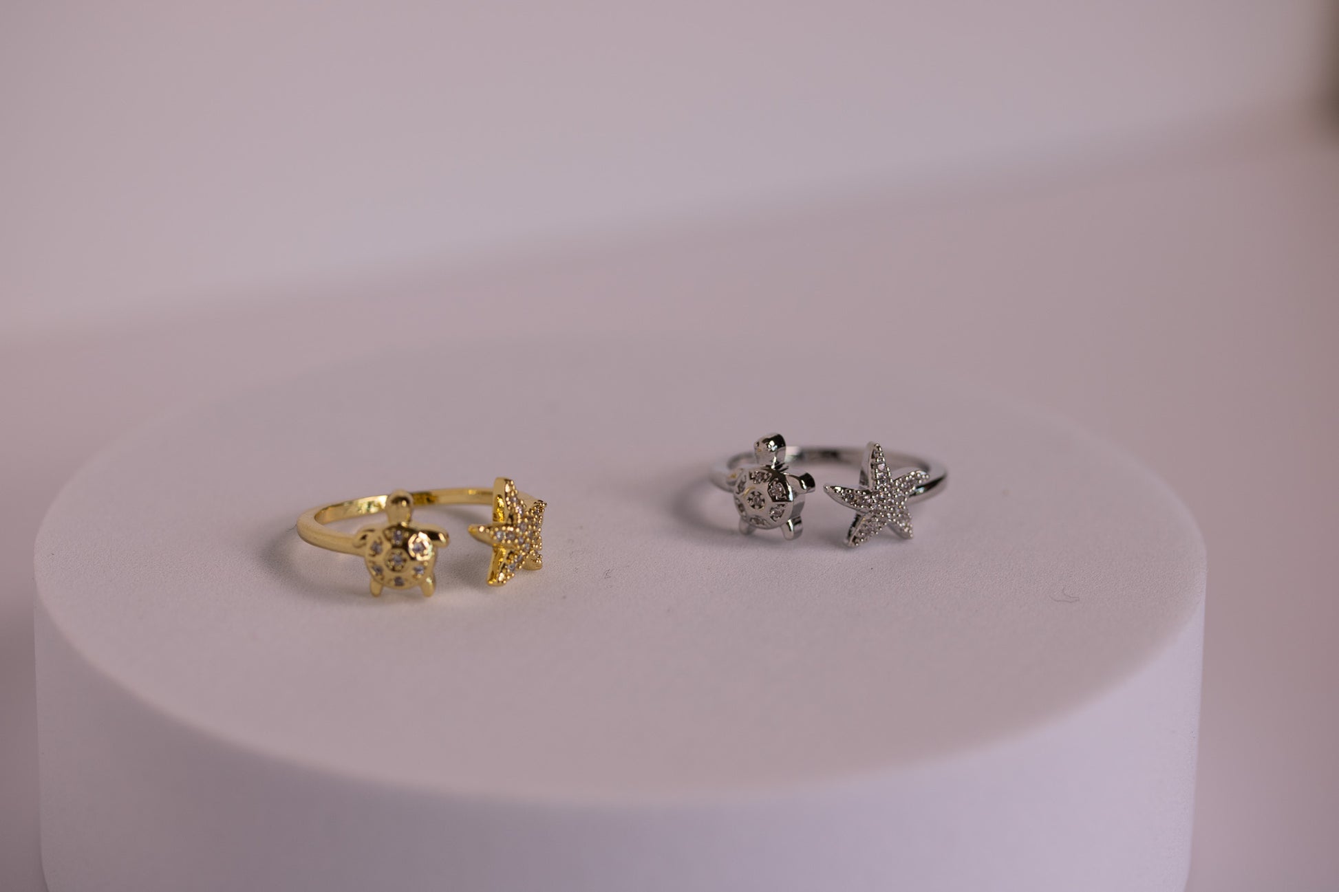A sweet splash of seaside charm. The Turtle Tales Ring brings together two coastal icons—a tiny turtle and a sparkling starfish—each dotted with delicate crystals that shimmer like sunlit waves. Available in warm gold or cool silver, this open-band design feels playful, airy, and easy to style with any everyday look.